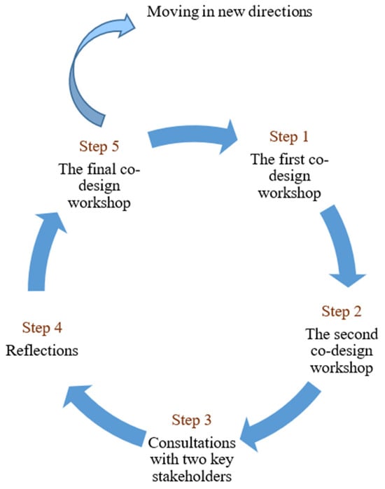A co-design methodology was employed to develop and conduct co-design workshops and consultations with community service providers. A five-step community-based participatory research cycle (Figure 1) [] guided the data collection process for this study. We developed this cycle based on McNiff and Whitehead’s action–reflection cycle [] and tested in a previous co-design study []. The action–reflection cycle, which includes the steps of planning, acting, observing, and reflecting, allows participants to continuously refine their practice based on evidence and reflection []. We adapted this model to shift the focus from action to a more participatory approach within community settings [], which enabled participants (called co-researchers) and researchers to collaborate on an interactive enquiry to address the research aim and answer research questions [,]. Co-researchers, being part of the community, are more likely to reflect the actual needs and priorities of older adults with ARHL. This research method not only enhances the cultural acceptability for the community members but also empowers co-researchers by valuing their experiential knowledge and involving them in the research process []. Consistent with these principles, this approach facilitated a collaborative and interactive data collection process, valuing the knowledge, sharing, and creative ideas contributed by co-researchers []. This paper adheres to the Consolidated Criteria for Reporting Qualitative Research (COREQ) checklist [].