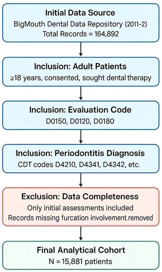 Patients were included if they had at least one completed treatment code for a comprehensive oral evaluation (D0150), a periodic oral evaluation (D0120), or a comprehensive restorative and periodontal exam (D0180). Furthermore, patients identified as having periodontitis were included if their records contained any of the following CDT codes indicating non-surgical or surgical periodontal treatment: D4210, D4211, D4240, D4241, D4245, D4260, D4261, D4263, D4266, D4274, D4341, D4342, or D4910.