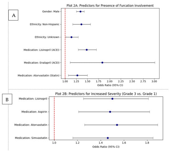 The present study investigated the relationship between the use of common systemic medications and both the presence and severity of furcation involvement in a large patient cohort. To the best of our knowledge, this is the first study with such a large sample size (15,881 cases from a pool of 164,892 records) and an extensive attempt to explore patient factors associated with the presence of furcation involvement in a multi-institutional EHR analysis of periodontitis patients. The large sample size made it possible to conduct a strong statistical analysis. Furcation involvement, a condition commonly associated with the progression of periodontal disease, can be influenced not only by local oral factors but also by systemic medications. Certain medications—such as anti-coagulants, statins, and ACE inhibitors—have been linked to a higher risk of periodontitis, which may in turn exacerbate furcation defects []. Additional medications, including antidepressants, oral hypoglycemic agents, calcium channel blockers, insulin, diuretics, and anticonvulsants, have also been implicated in increasing the likelihood or severity of periodontitis in various studies []. These associations highlight the importance of considering patients’ systemic health and medication history in periodontal diagnosis and management.