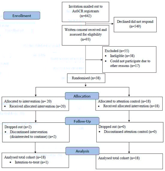 Overall, 642 AuSCR registrants were invited to participate in our trial, of which 93 (median age 69, 65% male) provided consent for further eligibility assessment (Figure 1). Of these, 55 met the trial criteria, and 38 participants were recruited and randomized (Table 1). A total of 36 participants completed the trial, with a mean age of 69 years (72% male). Two dropped out from the intervention group (during the intervention) as they were disinterested to continue. Preliminary adherence data indicate that most participants (98%) attended at least 10 of the 12 sessions and engaged in prescribed home meditation at least three times per week. Full feasibility outcomes will be reported in a separate manuscript.