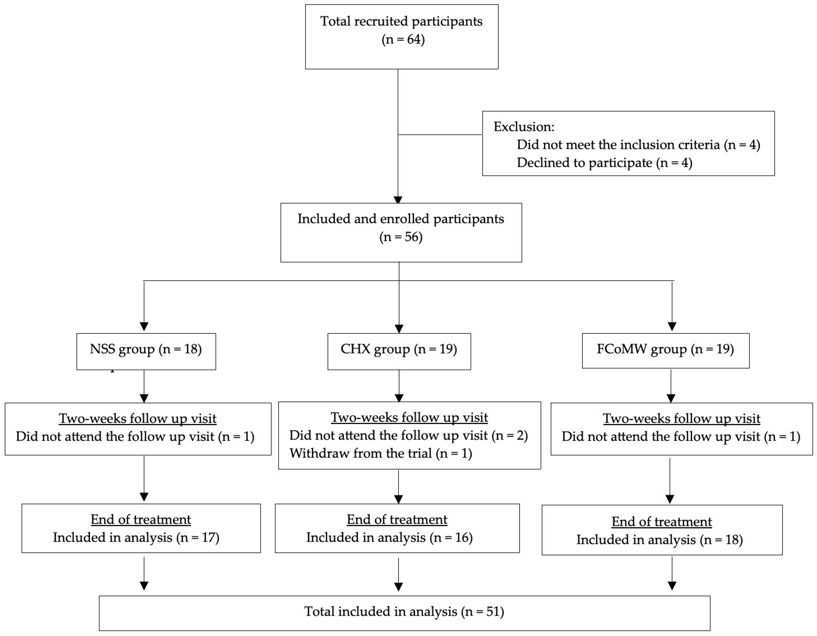 | Variables | NSS % (n = 17) | 0.12% w/v CHX % (n = 16) | FCoMW % (n = 18) | Total % (n = 51) | p-Value | |