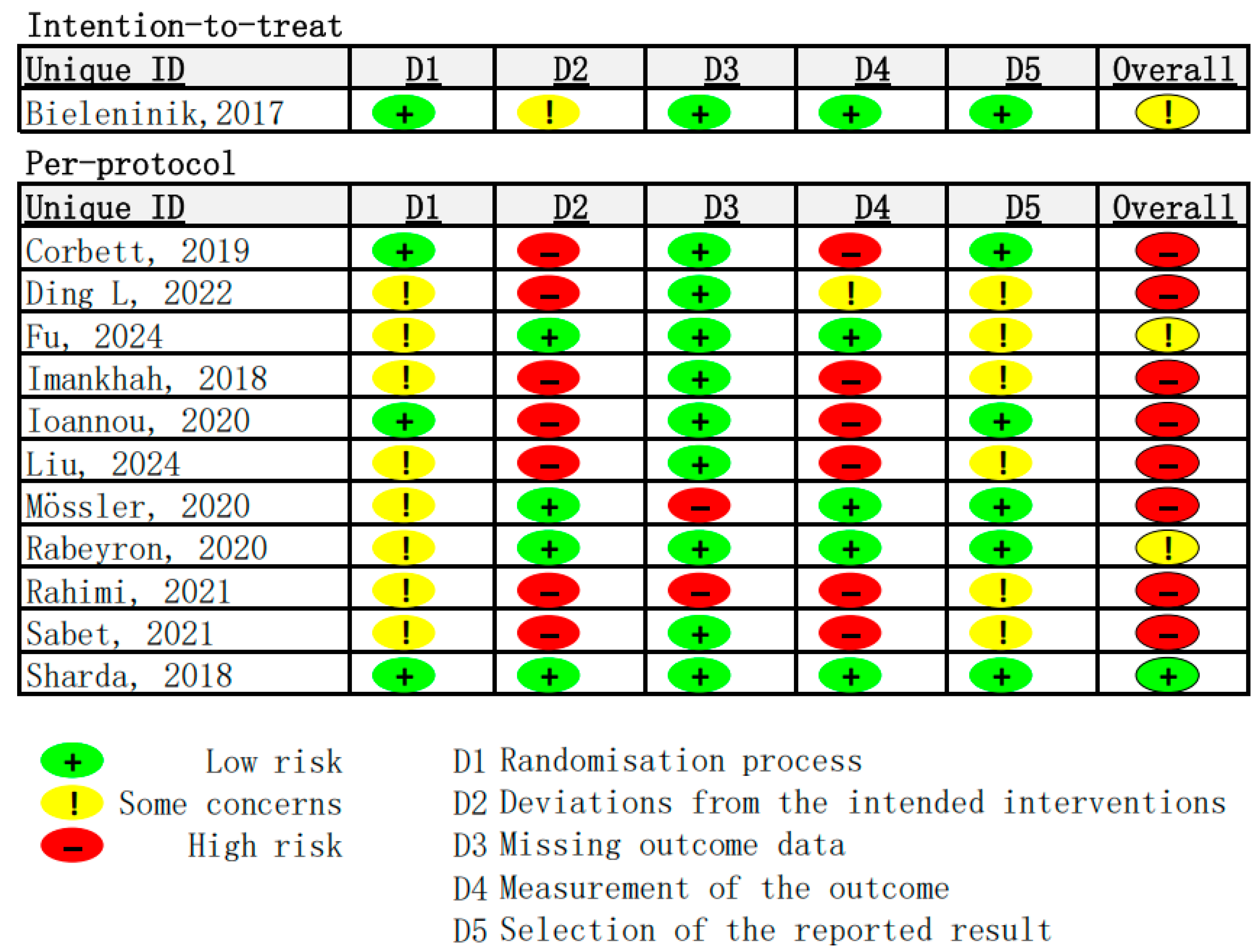 | No. | Study | Randomization Reported | Allocation Concealment | Baseline Comparability | Participants Blinding | Providers Blinding | Assessors Blinding | ITT Analysis | Eligibility Criteria | Sample Size Justification | Follow-Up Reported | Trial Registration | Variability Reported | Statistical Appropriateness | |