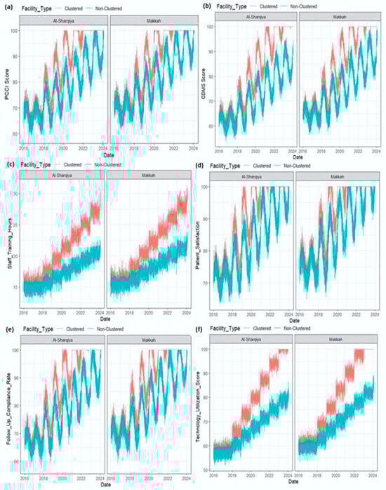 (a–f) Trends in Patient-Centered Care Index (PCCI), 2016–2024, clustered vs. non-clustered hospitals.