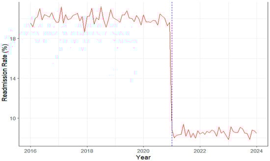 Trends in hospital readmission rate, 2016–2024, clustered vs. non-clustered hospitals. The red line represents monthly readmission rates, while the blue dashed vertical line indicates the timing of SHSTP clustering (2020/2021). Readmission rates remained around 18% before clustering (2016–2020) and declined sharply to about 10% afterwards, indicating improved post-discharge monitoring and continuity of care.