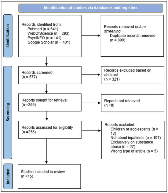 The scoping review aimed to identify and synthesize studies examining the key components and effectiveness of psychiatric rehabilitation programs in adult inpatient settings. An initial literature search identified 1476 studies across the four databases and registers: PubMed (n = 641), Web of Science (n = 293), PsycINFO (n = 141), and Google Scholar (n = 401). After removing 899 duplicate entries, 577 unique studies were screened based on title and abstract. Of these, 321 were excluded for failing to meet preliminary relevance criteria. The remaining 256 reports were retrieved and assessed for eligibility in full-text form. Following full-text screening, 241 articles were excluded for the following reasons: study population restricted to children or adolescents (n = 12), absence of an inpatient context (n = 197), exclusive focus on substance use disorders (n = 27), or wrong publication type (n = 5). Overall, 15 studies met the inclusion criteria and were included in the final synthesis. A detailed overview of the screening and selection process is depicted in Figure 1. The specific details of the included studies are available in Supplementary Materials.