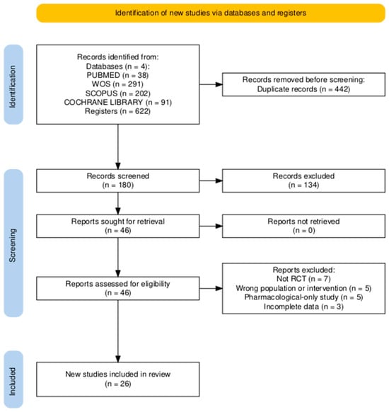 A total of 622 records were identified through database searches (PubMed, Scopus, Web of Science, and Cochrane Library). After removing 442 duplicates, 180 unique records remained for title and abstract screening. Of these, 134 records were excluded at the title and abstract screening stage, did not meet the inclusion criteria in terms of population, intervention, or study design, and 46 full-text articles were assessed for eligibility. Finally, 26 randomised controlled trials (RCTs) met the inclusion criteria and were included in the qualitative synthesis.