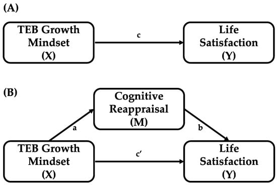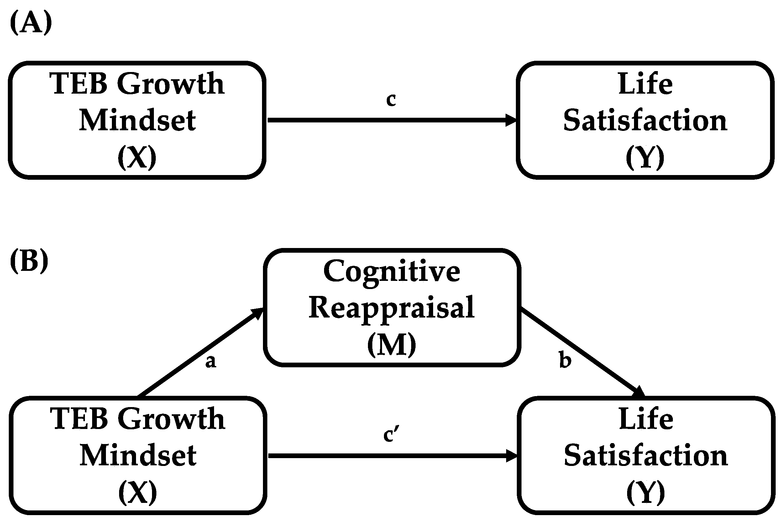 (A) Illustration total effect: X affects Y. (B) Illustration of the proposed mediation model: X affects Y indirectly through M. a-path represents the effect of mental health growth mindset on cognitive reappraisal. b-path represents the effect of cognitive reappraisal on life satisfaction. c-path and c’-path indicate the direct effect of mental health growth mindset on life satisfaction.