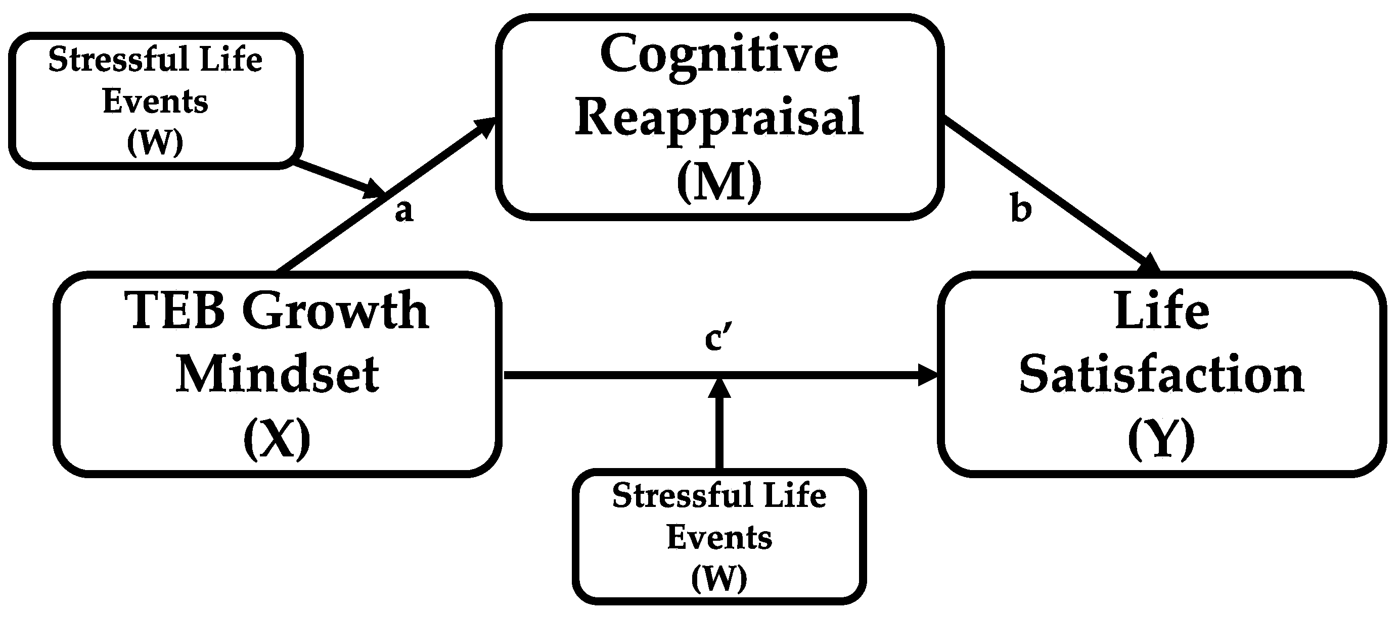 We extend prior research in three ways. First, we use life satisfaction as a positive indicator of well-being rather than traditional indicators which are deficit-oriented (e.g., distress). Second, guided by self-regulatory theory and the evidence above, we focus on cognitive reappraisal as the mediating process because it is theoretically proximal to emotion-related mindsets, experimentally responsive to mindset interventions, and conceptually linked to emotion-regulation flexibility and positive affect [18,29,30,31,32,33]. Third, we examine perceived stress as a contextual moderator to assess whether the benefits of adaptive beliefs and reappraisal vary by stress level—enhancing well-being under manageable stress but diminishing under chronic, high-stress conditions.