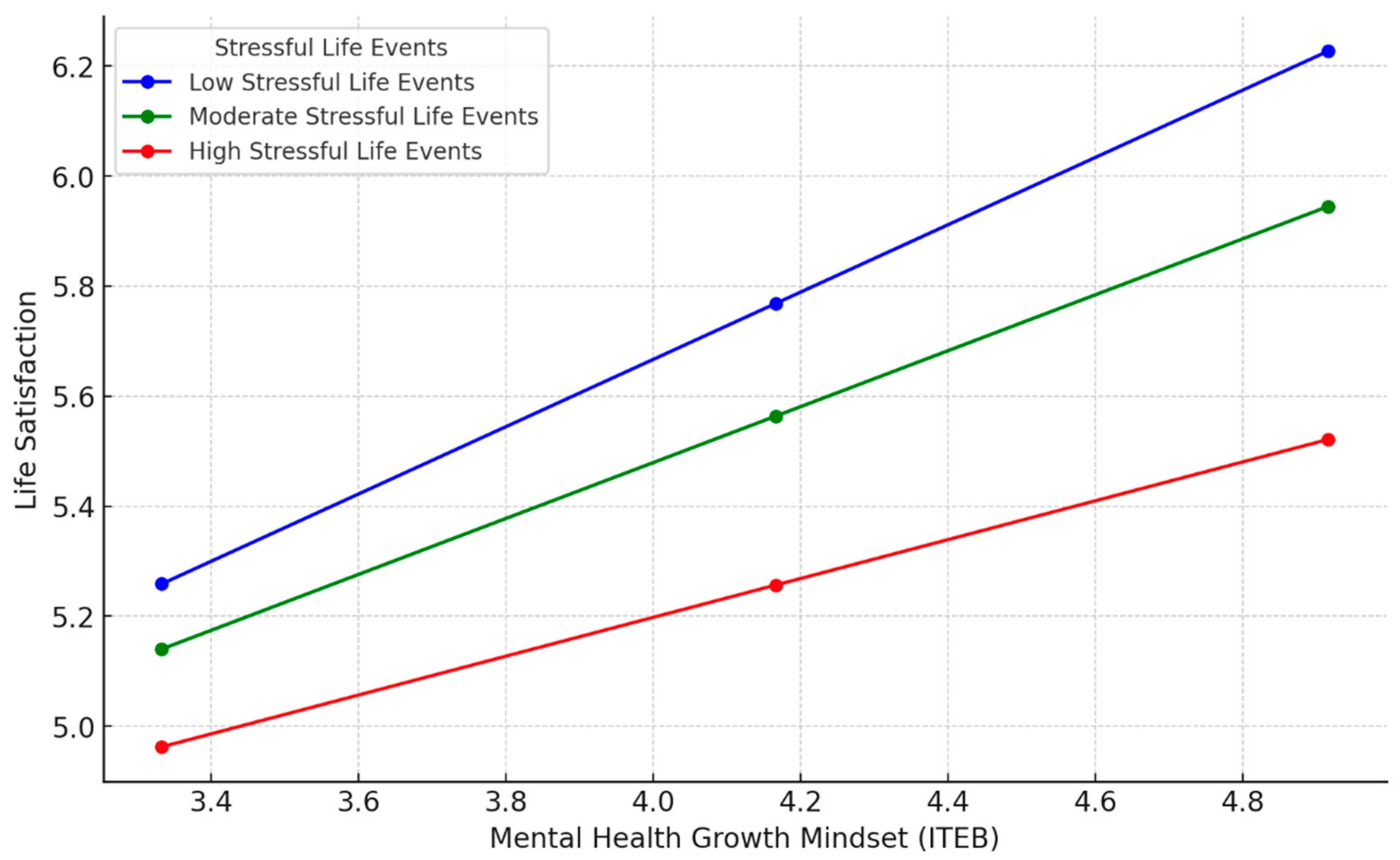 Importantly, the findings also align with contemporary resilience frameworks emphasizing that youth well-being reflects the joint operation of assets and stressors, rather than the absence of pathology alone. Dual-factor models highlight that mental health is best represented by two related but distinct continua—subjective well-being and psychological distress [62,63]. Within this framework, ITEB may operate as both a promotive factor that supports well-being and as a potential vulnerability factor when contextual affordances are limited. Our results illustrate this duality: under lower stress, adolescents with stronger growth beliefs reported higher life satisfaction, yet under higher stress, the direct benefits of these beliefs diminished. This pattern is consistent with resilience science, which argues that adaptive systems—including close relationships and stable learning environments—must remain intact for individual assets such as self-regulation to function effectively [4]. When stress is high and external supports are strained, growth beliefs may be harder to enact, reducing their observable benefit.
