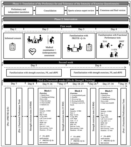 A familiarization process with a comprehensive reading of PRETIE-Q-Sv, functional performance tests, strength exercises, and the affective and perceptual scales to use was carried out. Subsequently, the BST was carried out over three 4-week blocks (12 weeks total), with two sessions per week on non-consecutive days, in groups of 10–14 participants. The blocks (block 1, B1; block 2, B2; and block 3, B3) were designed according to the model of functional consequences of age-related sarcopenia (i.e., ↓ strength; ↓ power; ↓ muscular endurance) proposed by Hunter et al. [28] and in line with previous studies [21,22]. The novelty with these studies and the present one was the inverted order of B2 and B3. A professional with experience in training older adults was responsible for leading the sessions (including a standardized 10 min warm-up and cool-down section, respectively) and completing the attendance register of the participants. The PRETIE-Q-Sv was applied before training program and after the last session of each block of the BST program (i.e., three times) in a comfortable environment, guaranteeing privacy and availability of personalized assistance from researcher. Additionally, affective valence using the Feeling Scale (FS) [29] and session Rating of Perceived Exertion (sRPE) [30] were reported after each session, and averaged to a single value per block. Finally, functional performance was also evaluated before and after the BST (Figure 1; middle-bottom panel).