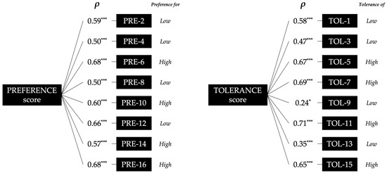 Spearman’s rank correlation coefficient (ρ) between individual items of the Preference and Tolerance scales and their respective total scores. The terms “low” and “high” refer to Preference for low or high exercise intensity, and to low or high Tolerance of uncomfortable intensity, respectively. * p < 0.05; *** p < 0.001.