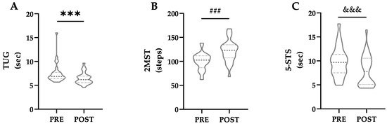 Functional performance in (A) Timed Up and Go (TUG), (B) Two-Minutes Step Test (2MST), and (C) Five Times Stand-to-Sit Test (5-STS) pre- and post-Block Strength Training. *** p < 0.001, rb = 0.94; ### p < 0.001, rb = −1.00; &&& p < 0.001, d = 1.25.