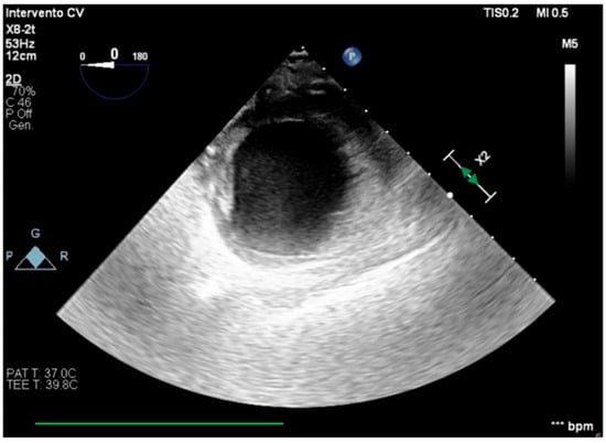 We describe a case of a 75-year-old woman affected by a post-myocardial-infarction ventricular septal defect (VSD) and a left-ventricle (LV) apical aneurysm. The patient underwent surgery for VSD closure and aneurysm exclusion. The patient had a STEMI (ST-elevation myocardial infarction), with evidence of occlusion of the anterior interventricular artery, for which thrombus aspiration and stenting of the left coronary artery and proximal anterior interventricular artery was performed. Then, she developed cardiogenic shock with pulmonary edema and thus required the support of an IABP (intra-aortic balloon pump) of C-PAP and levosimendan in continuous infusion for 24 h. Seven days after the event, a large post-infarct VSD at the apical level with a left–right shunt occurred. She was therefore transported from the spoke center to our hospital and underwent surgical treatment, namely, post-infarct VSD closure and exclusion of a left ventricular aneurysm. The intra-operative transesophageal echocardiography showed concentric LV remodeling, slight dilatation, LVEF 28% (Figure 1), and akinesia of the mid-apical segments in toto with aneurysmal evolution (Figure 2).