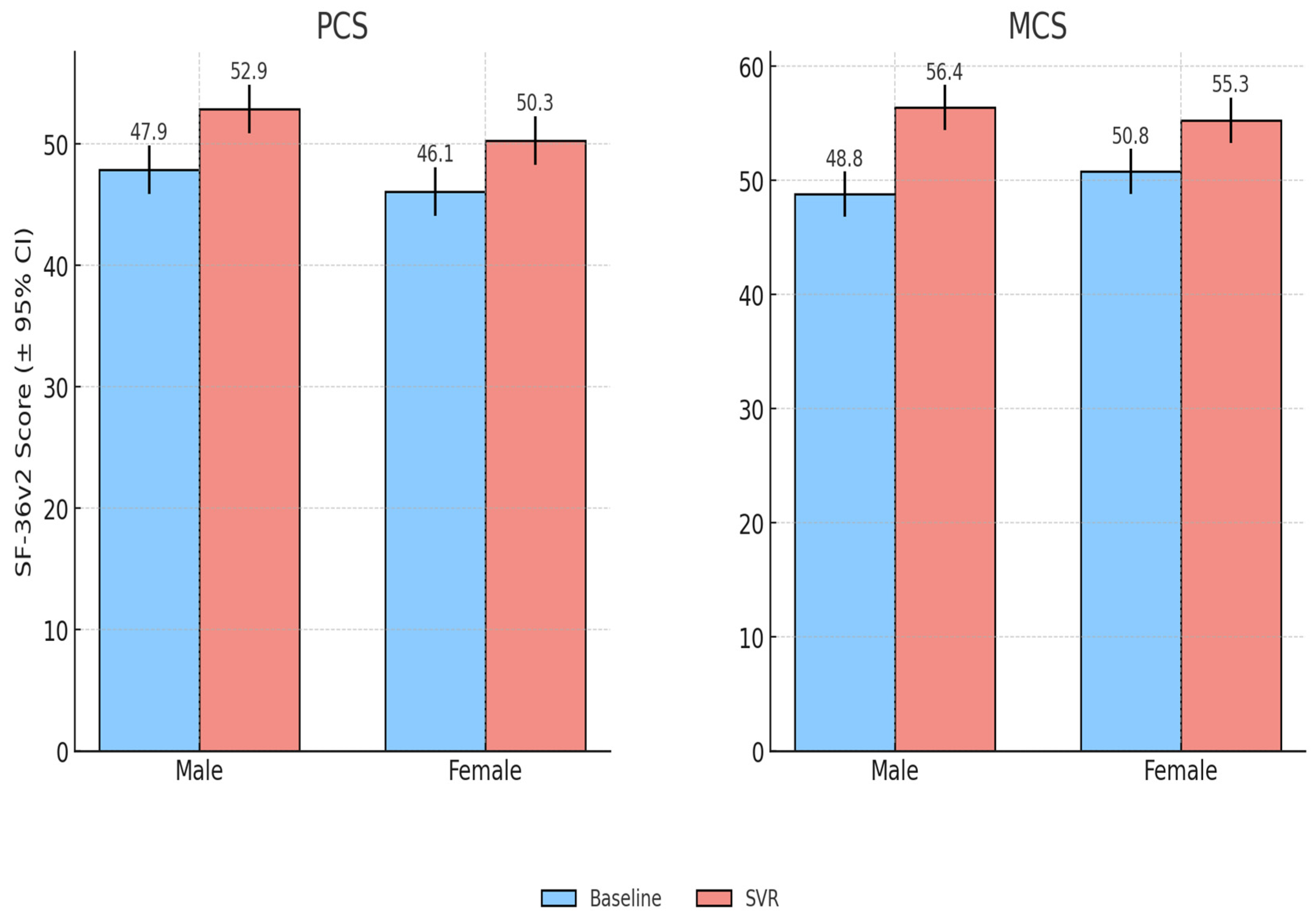 Domain-level analysis showed modest gender-specific patterns: women reported larger gains in vitality and role emotional, while men showed greater improvements in physical functioning. Importantly, the proportion of patients achieving clinically meaningful improvement (≥5 points in PCS or MCS) was similar between groups (males 72%, females 69%), suggesting that QoL benefits of viral clearance were broadly comparable across sexes (