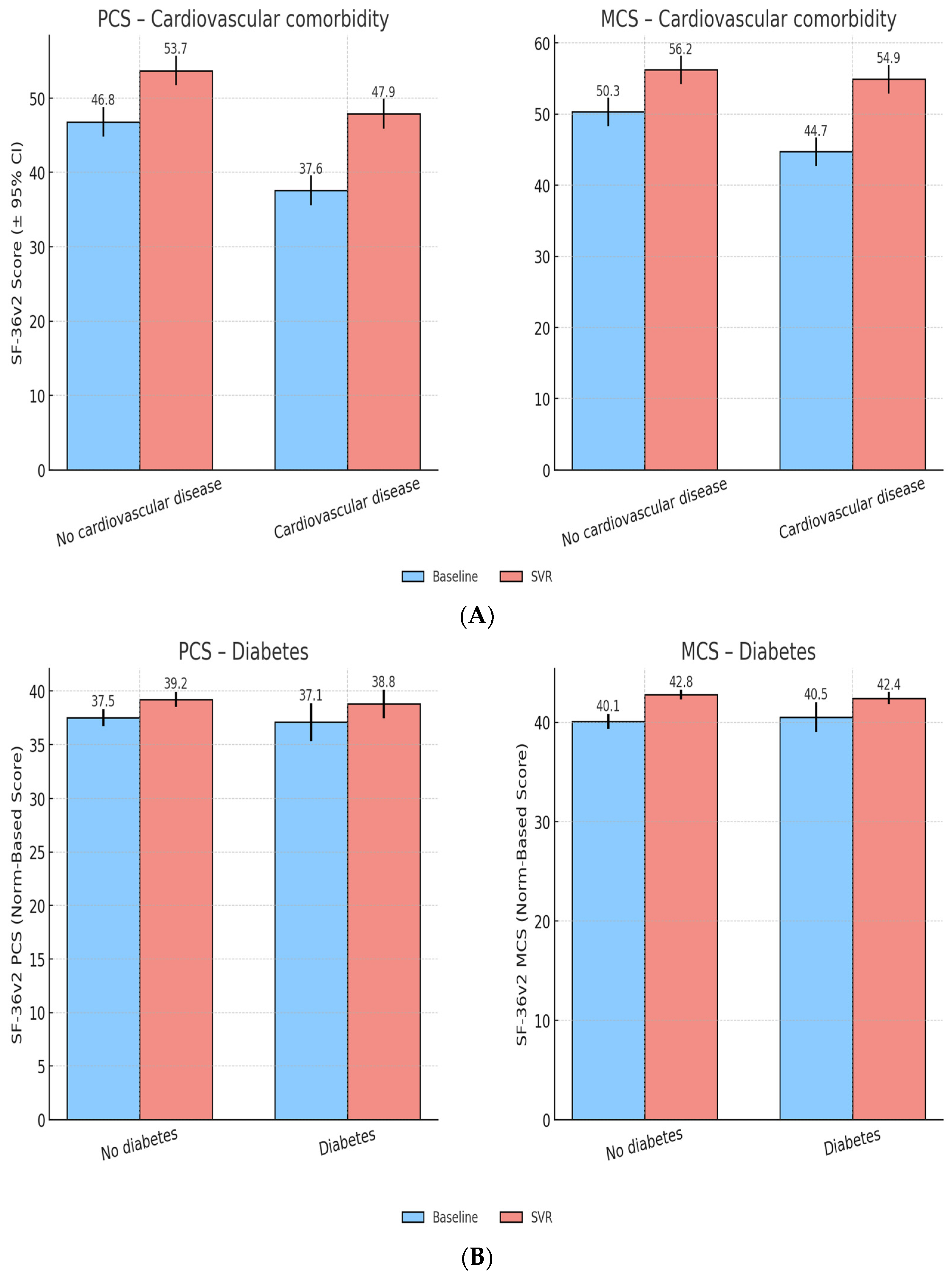 Patients with cardiovascular comorbidities started with lower PCS (44.3 ± 8.8) and MCS (48.7 ± 7.9) scores compared to those without (PCS 48.9 ± 8.2, MCS 51.3 ± 7.1). After SVR, both groups showed improvements, though gains in PCS were smaller in the cardiovascular group (+3.8 vs. +5.2,
