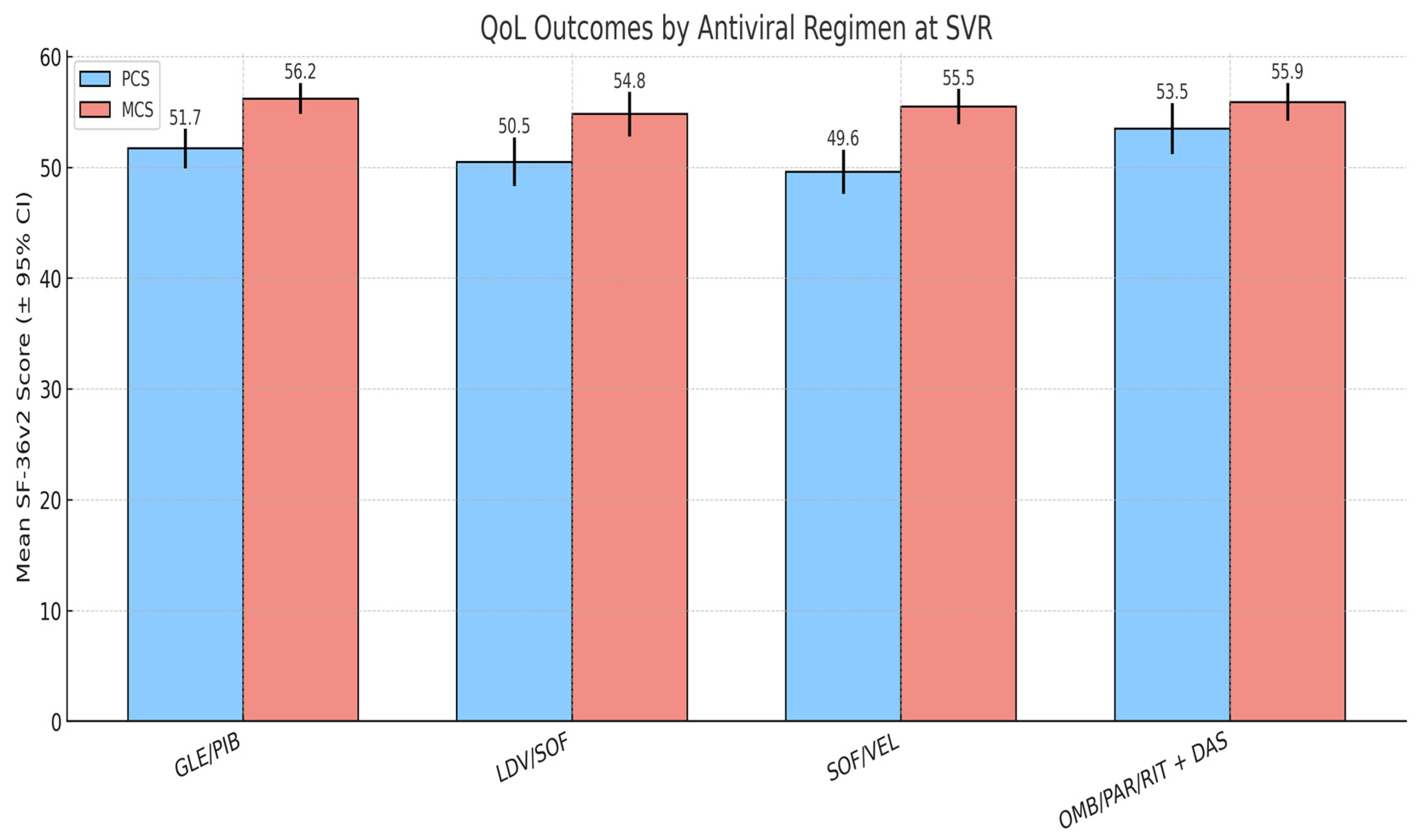 Although small numerical differences were observed, none reached statistical significance, indicating that regimen type had a minimal impact on QoL outcomes. These results suggest that the benefits of viral clearance on patient-reported well-being are consistent across commonly used DAAs, and that comorbidity burden exerts a stronger influence on post-treatment QoL than antiviral regimen choice (
