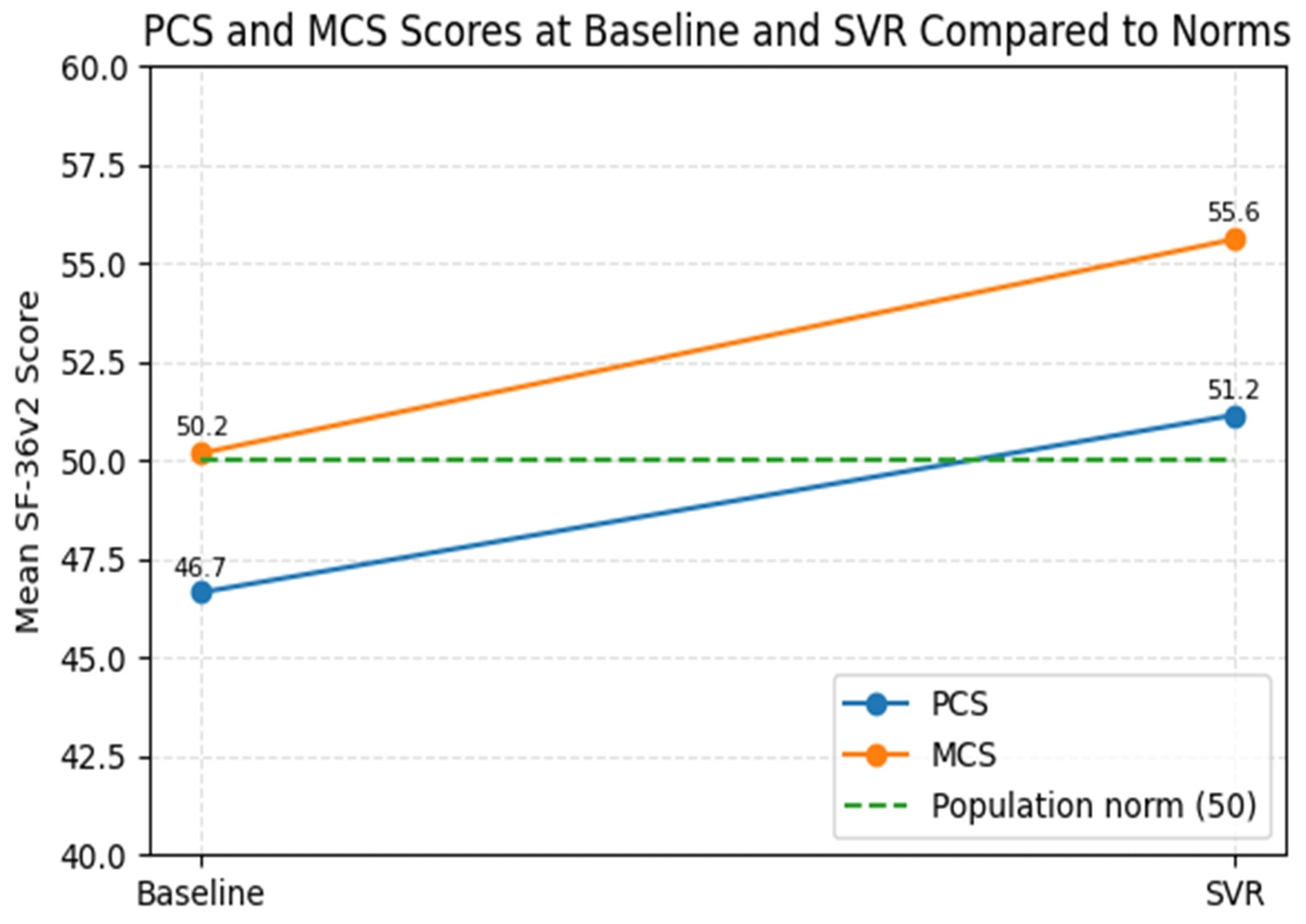 By SVR, mean PCS values slightly exceeded the population norm, and mean MCS scores clearly exceeded it. Together with the shift in the distribution of scores, these findings indicate a clinically meaningful improvement in MH and a partial normalization of PF (