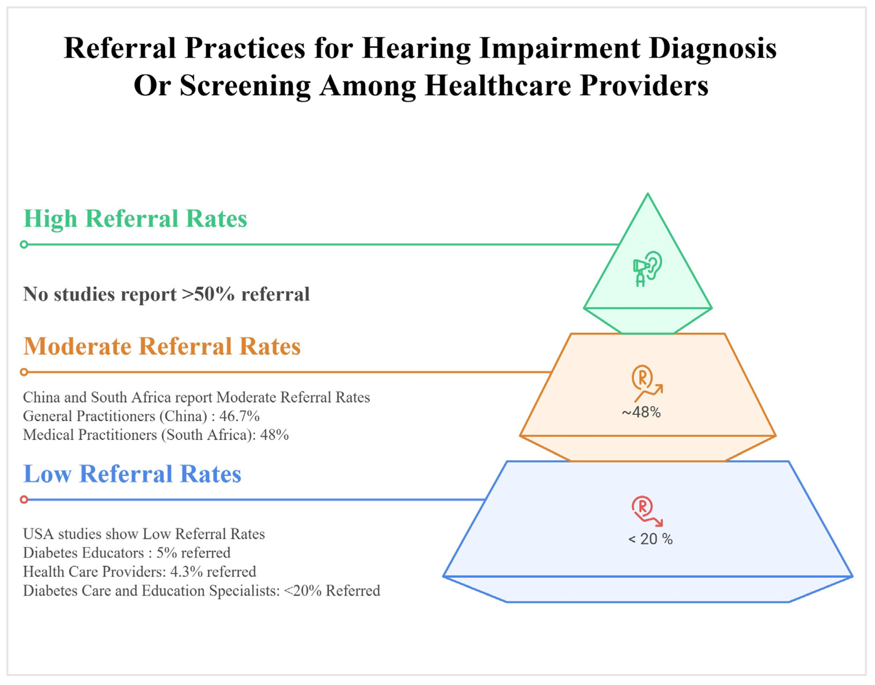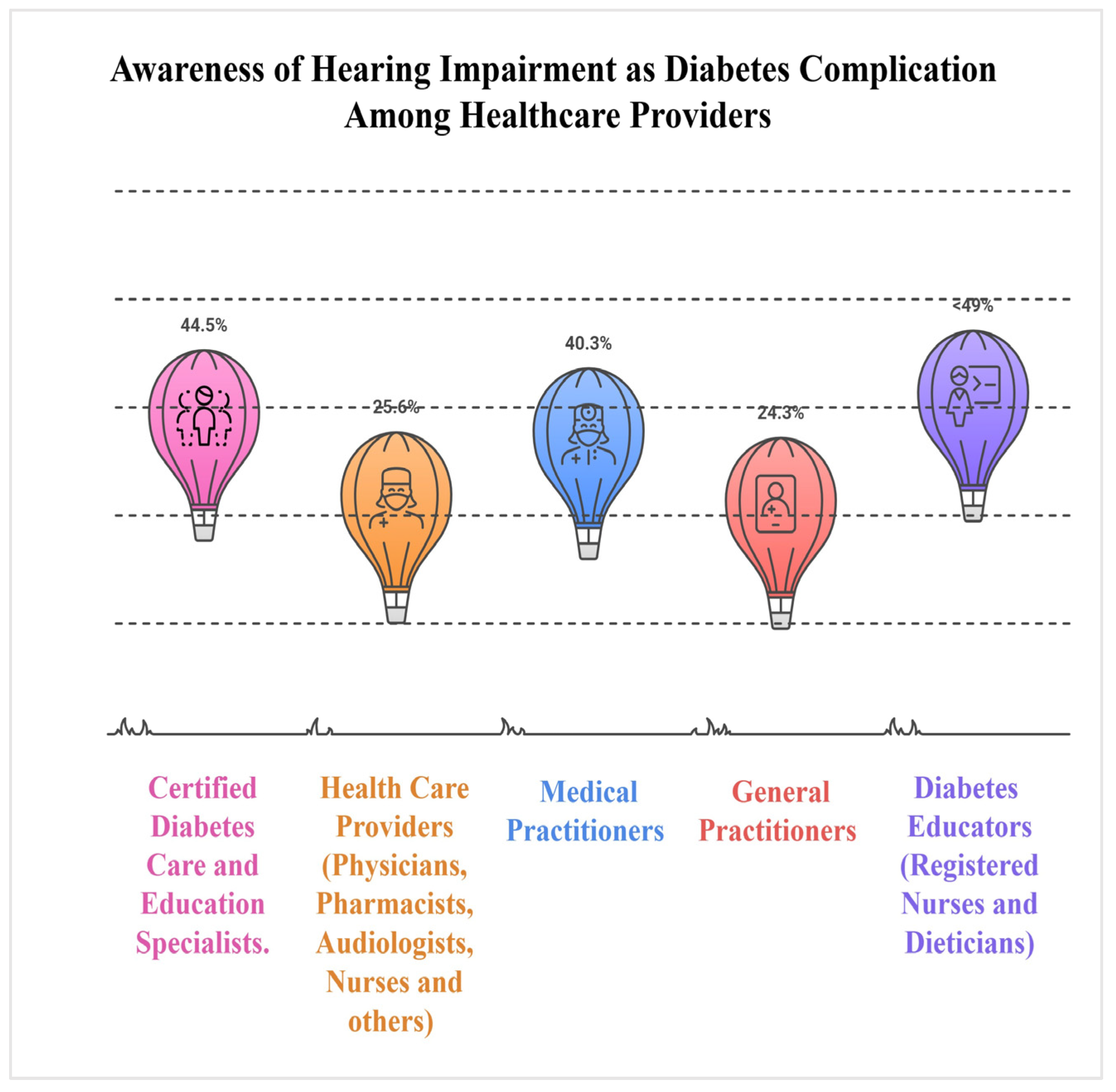- Knowledge of diabetes-related hearing loss was substantially lower among both providers and patients compared to other complications, reflected in poor screening attitudes, minimal practices and counseling, and hearing screening rates.
