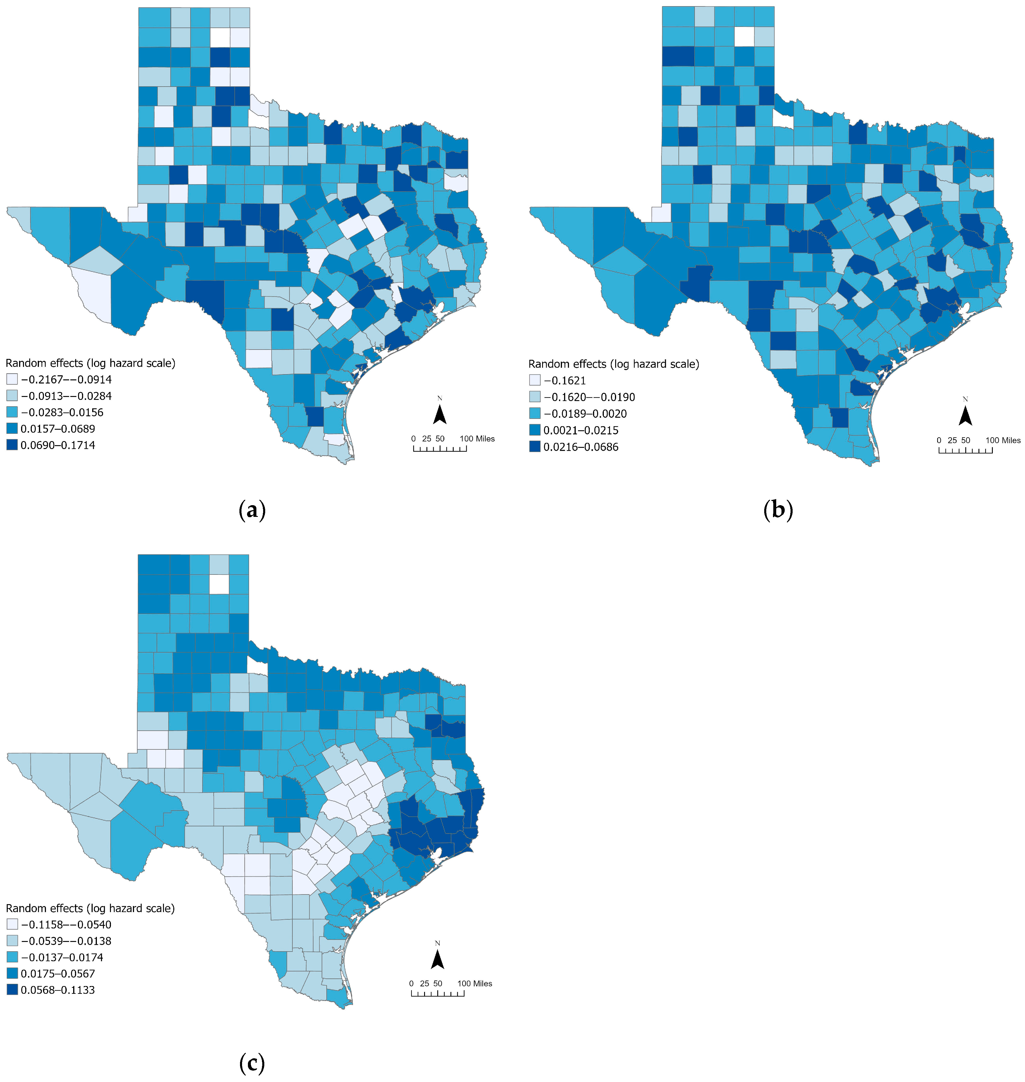 At the county level, socioeconomic and contextual factors displayed varying significance across the models. The following five variables are significant in Model 1: Urbanicity Rate (HR = 0.863, p = 0.000), Poverty Rate (HR = 0.989, p = 0.000), Disability Rate (HR = 1.009, p = 0.000), Veteran Population Rate (HR = 0.992, p = 0.000), and Unemployment Rate (HR = 1.008, p = 0.031). However, only two variables are significant in Models 2 and 3: Poverty Rate (HR = 0.993, p = 0.006) and Disability Rate (HR = 1.010, p = 0.013) in Model 2, and Disability Rate (HR = 1.009, p = 0.019) and Veteran Population Rate (HR = 1.011, p = 0.004) in Model 3. That is, when county-level random effects and/or spatial autocorrelation at the county level are accounted for, the inferential results are different. Given that Model 3 is preferred over the other two models, it is appropriate to interpret their coefficients based on Model 3.