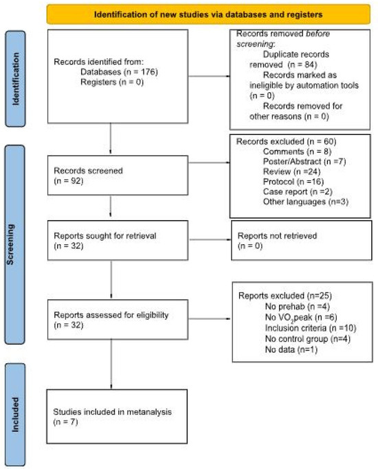The initial database yielded 176 articles from the database search. We excluded 84 articles because they were duplicates. After screening the titles and abstracts of the remaining 92 articles, we excluded 60 articles for the following reasons: 8 were comments, 7 were posters or abstracts, 24 were reviews, 16 were protocols, 2 were case reports, and 3 were not written in English. We assessed the full texts of the remaining 32 articles for eligibility. Of these, we excluded 25 articles because they did not meet the inclusion criteria (n = 10), did not have a prehabilitation intervention (n = 4), did not evaluate change in VO2peak (n = 6), did not have a control group (n = 4), or did not have data available (n = 1). Thus, we included seven articles in the qualitative synthesis. Figure 1 shows the PRISMA flow diagram.