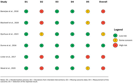 Summary of risk-of-bias judgments for the included studies, assessed using the Cochrane Risk of Bias 2 (RoB 2) tool [12,16,20,21,22,23].