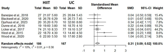 The present study revealed a small but significant difference between HIIT and UC intervention programs of 0.31 [0.09, 0.52] (see Figure 2) with a low degree of heterogeneity among the considered studies (I2 = 10.0%, τ2 < 0.0001, p = 0.36). Across cancer types, our results indicated differences inVO2peak in favor of the HIIT exercise program during prehabilitation intervention, confirming the benefit of this type of intervention. Interestingly, greater standardized mean differences among studies were observed in patients with lower baseline VO2peak values (see Figure 2 for more details). Therefore, these findings are crucial in the context of prehabilitation, considering the known inverse association between VO2peak and postoperative complication risk [9,11] and survival rates [12,13]. Additionally, a high VO2peak level may positively influence activities of daily living [25] and, consequently, the quality of life in patients with cancer [26,27].