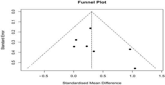 A total of seven studies were included in the meta-analysis. Meta-analysis indicated that the combined effect size SMD = 0.31 [95% CI 0.09, 0.52], p < 0.01, suggesting a statistically significant difference compared to the UC group, and that HIIT was effective in improving VO2peak in patients with cancer during prehabilitation period. Although the pooled effect size (SMD = 0.31) reached statistical significance, its magnitude represents a small-to-moderate improvement, which should be interpreted with caution regarding clinical relevance. Nevertheless, even modest improvements in VO2peak may contribute to better surgical tolerance and recovery in cancer prehabilitation. The heterogeneity test results revealed that it was low (I2 = 10.0%; τ2 < 0.04; p = 0.36). Forest plot results are presented in Figure 3. Publication bias was assessed through visual inspection of the funnel plot and Egger’s regression test. The plot appeared symmetrical, and Egger’s test showed no significant asymmetry (z = 1.07, p = 0.29), indicating no evidence of publication bias (Figure 4). Although visual asymmetry may appear more pronounced when few studies are available (n = 7), this pattern is expected in small-sample meta-analyses, and the non-significant Egger’s test supports that publication bias is unlikely.