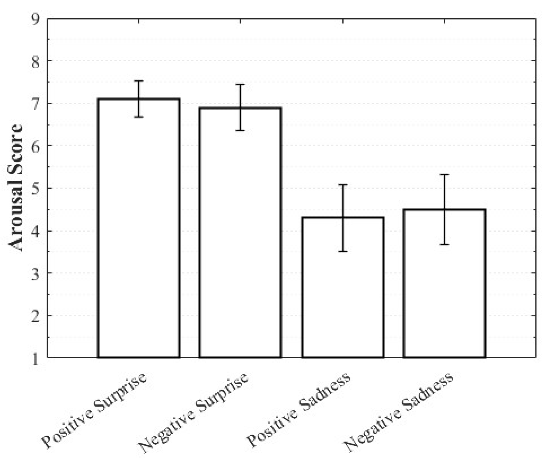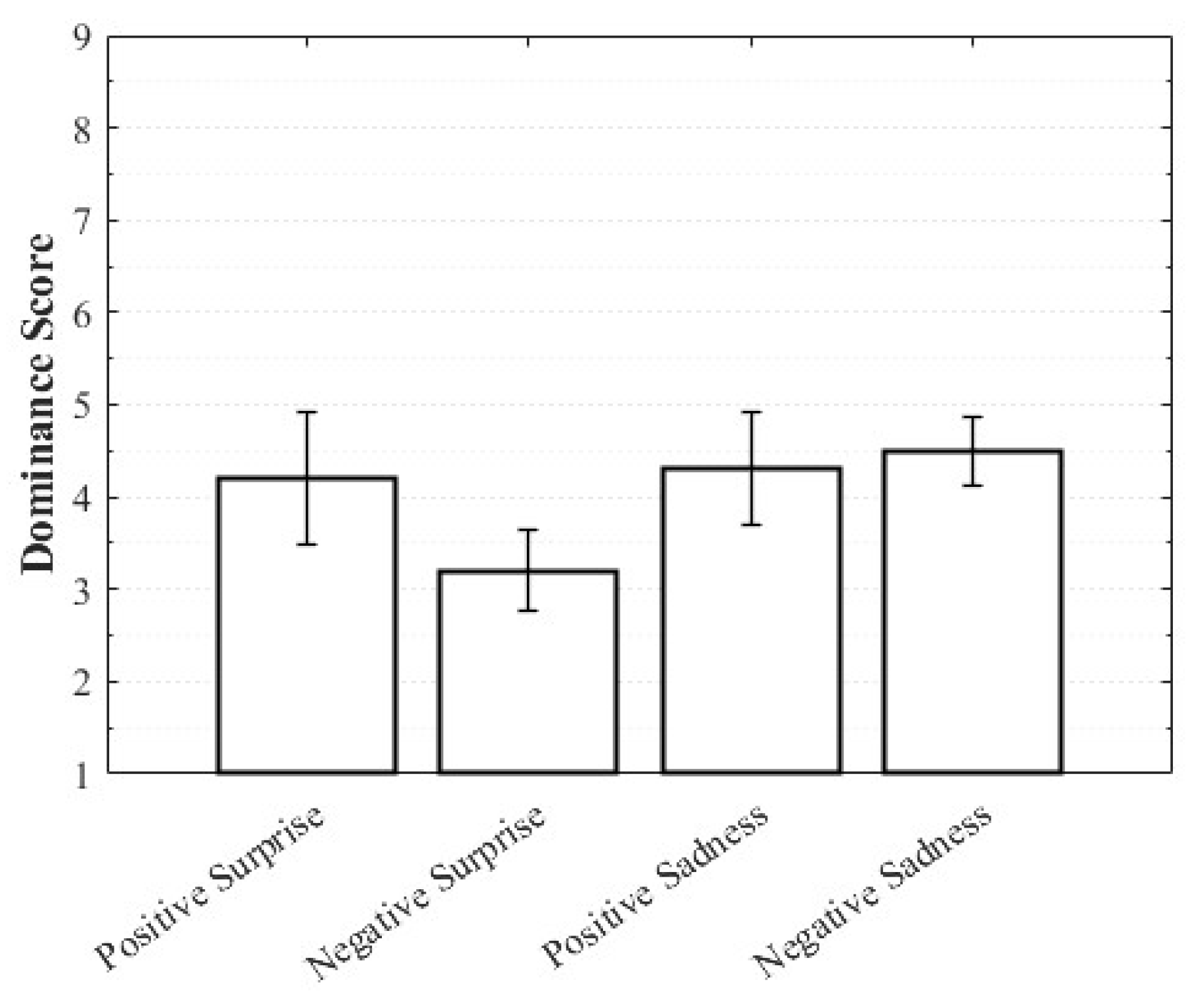 Positive Surprise was characterized by relatively high valence and arousal with moderately low dominance, whereas Negative Surprise exhibited low valence, high arousal, and low dominance, yielding a profile similar to fear. Both Positive Sadness and Negative Sadness demonstrated similarly low arousal and dominance, but with opposite valence trends. These findings suggest that both emotions share a common subjective basis in sadness yet diverge along the valence dimension. The observation that VAD scores differed within the same emotional category depending on whether the stimulus was perceived as positive or negative highlights the complexity of emotions and the directional distinctions defined by valence (