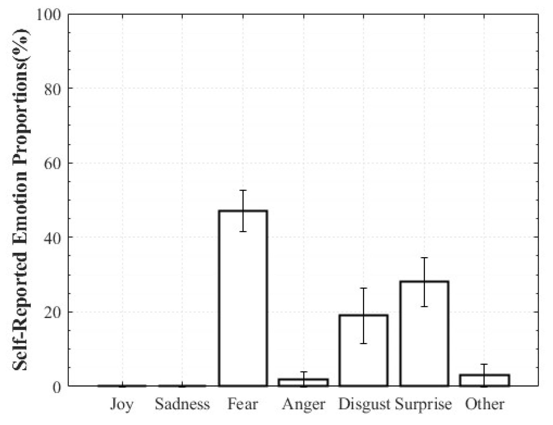 For Positive Surprise, the reported composition was 27% Surprise and 66% Joy, indicating simultaneous activation of surprise and positive affect. Some participants additionally reported Fear and Disgust, explaining that the intensity of being startled led them to select those emotions. Negative Surprise was reported as 28% Surprise, 47% Fear, and 19% Disgust, suggesting that surprise co-occurred with multiple negative affective states. For Negative Sadness, participants reported on average 83% Sadness, 6% Fear, and 9% Anger, indicating that sadness was the dominant emotion accompanied by other negative emotions. In contrast, Positive Sadness elicited 52% Sadness and 34% Joy, reflecting the coexistence of theoretically opposing emotions. This pattern demonstrates that experiences described as “moving” can involve a blend of sadness and joy (