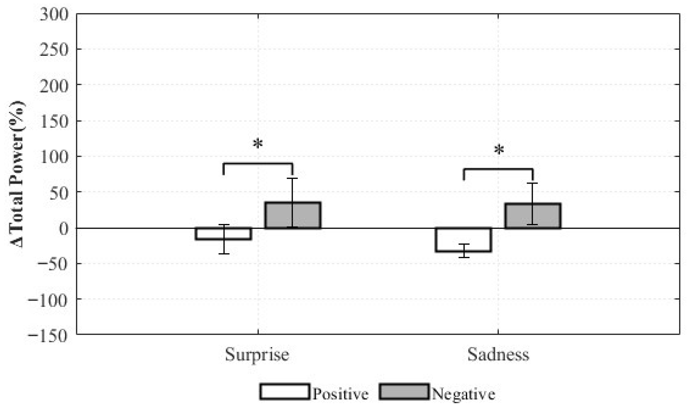 Relative Changes in Total power for Complex Emotions (* p < 0.05).