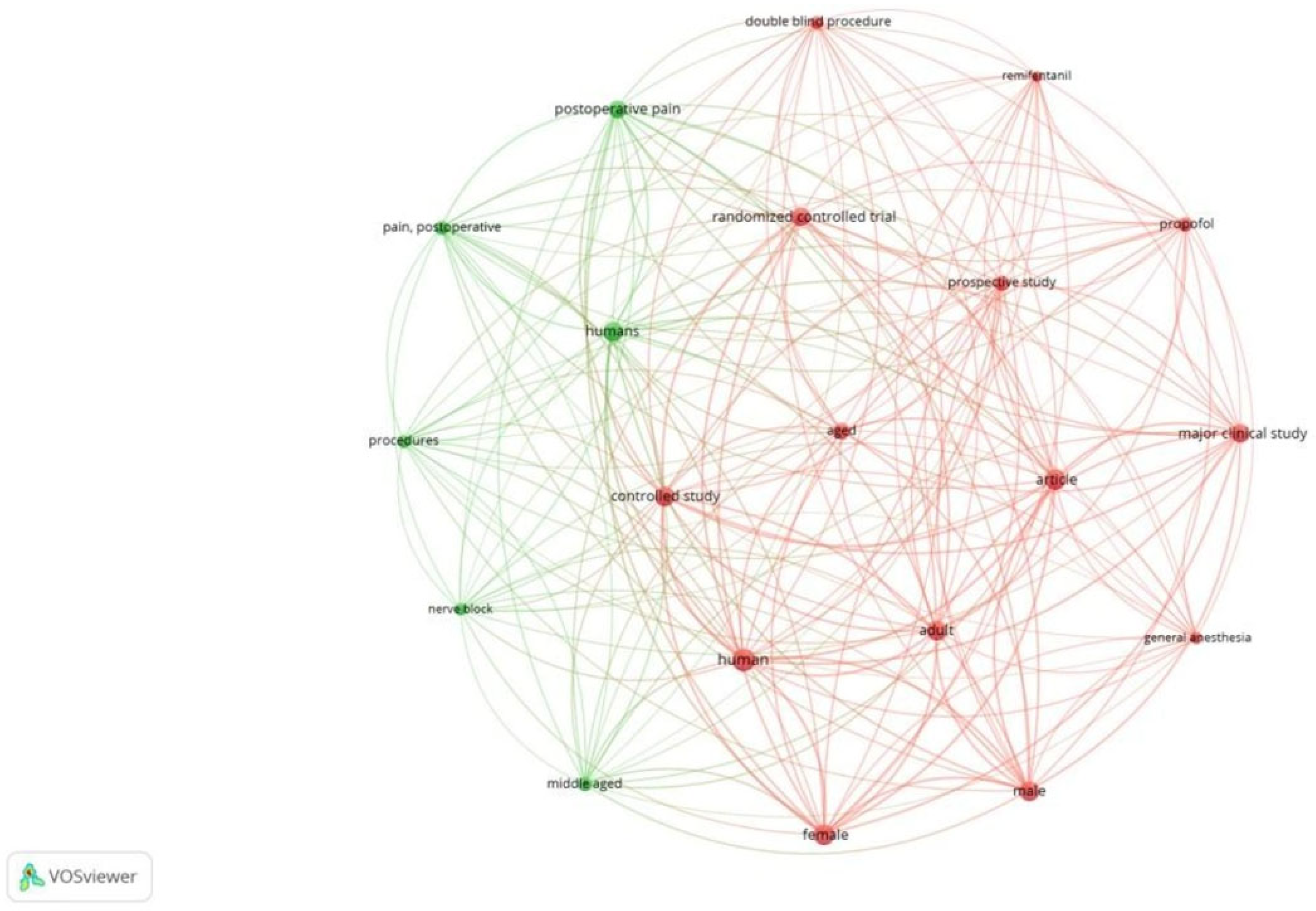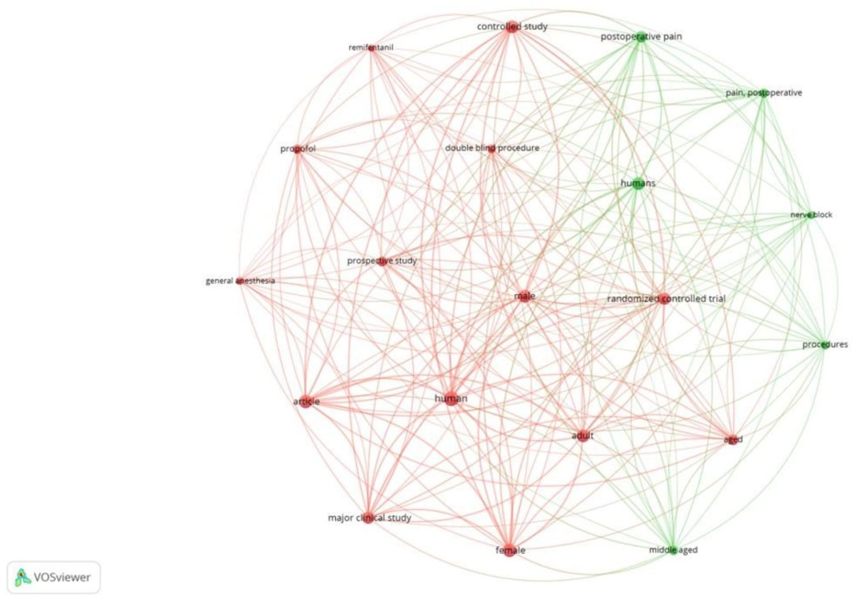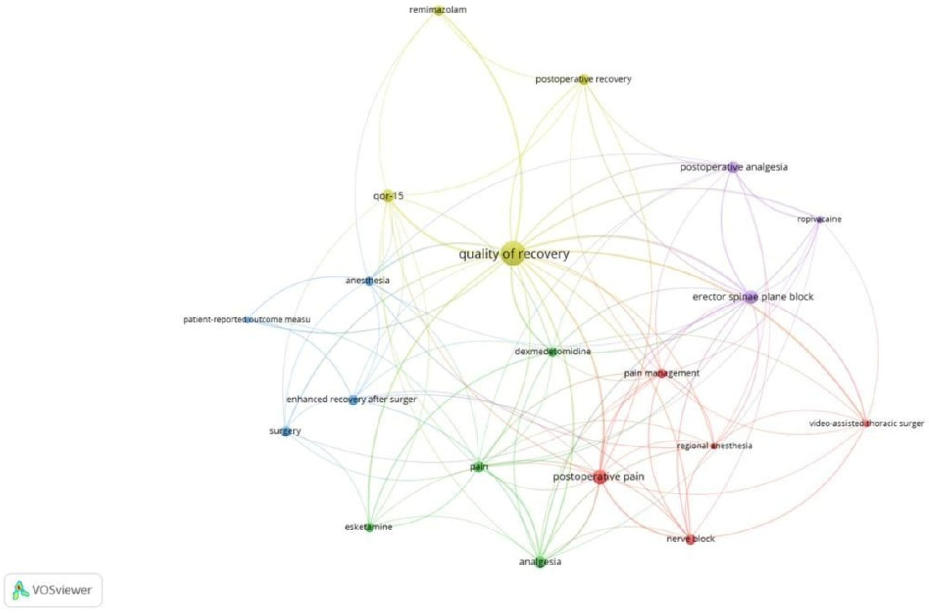 Figure 3 is a network created with 20 keywords. Clusters highlight thematic focus areas, including quality of recovery, enhanced recovery pathways, and regional anesthesia techniques.