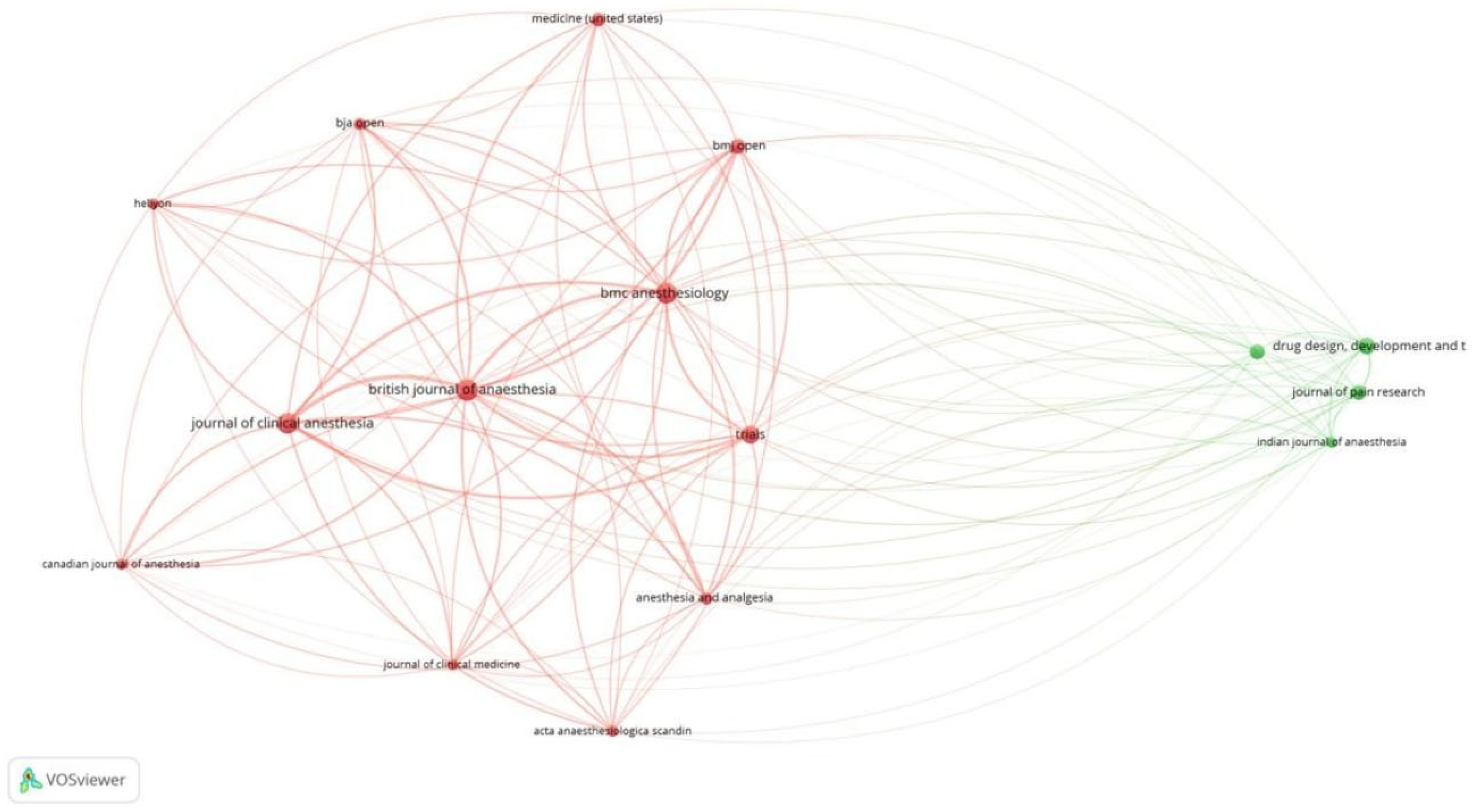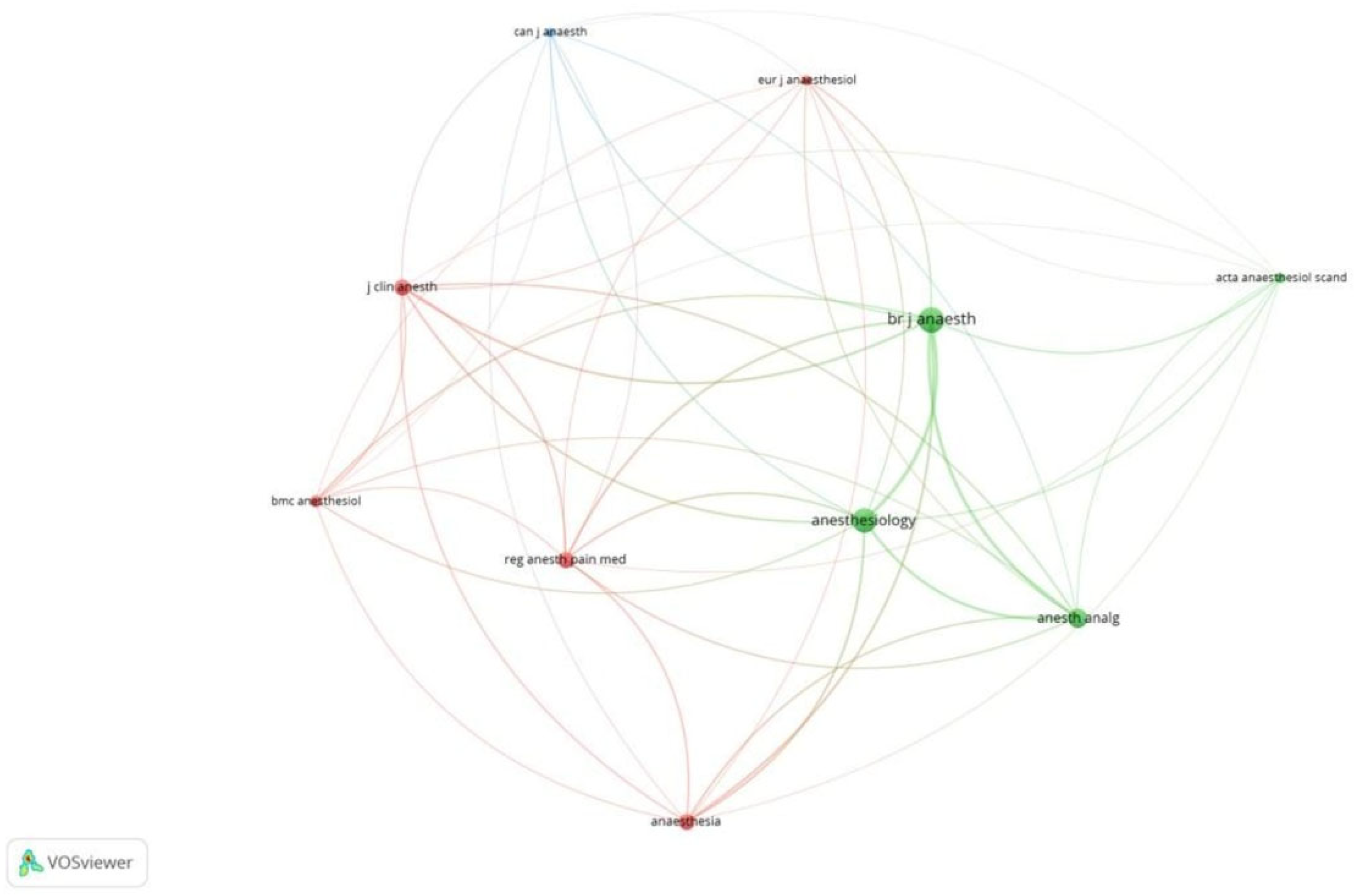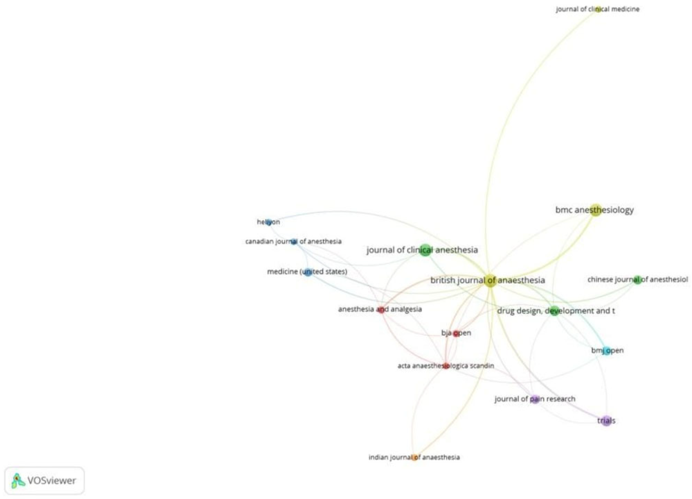 Figure 8). Of the 2515 sources, 68 met the threshold. We created a network using the top 10 sources. BJA had the maximum citation among all sources, at 716 (
