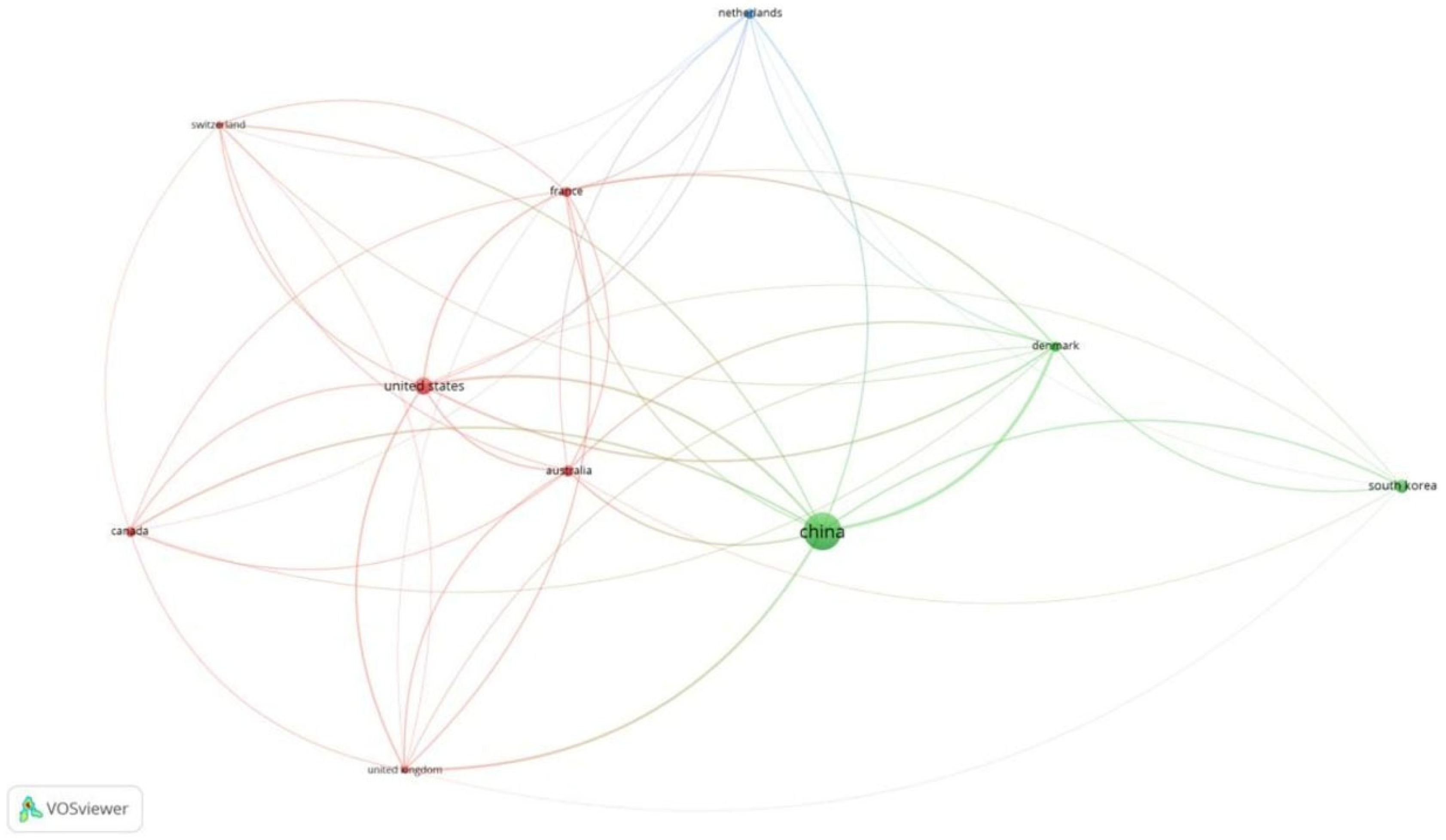 Table 2C). Of the 43 countries, 18 met the threshold. We created a network of the top 10 countries. China had 164 documents and 952 citations for the same (