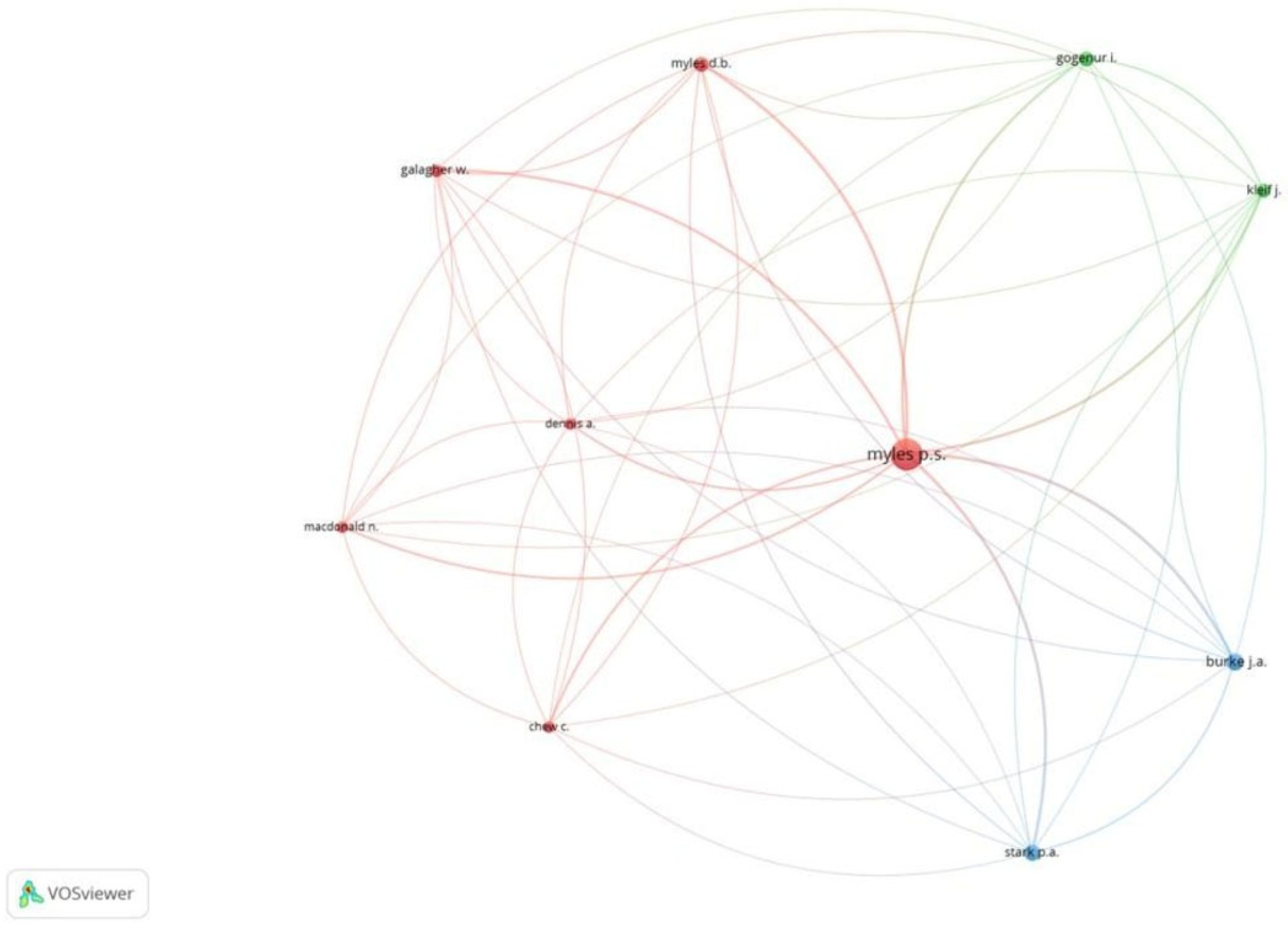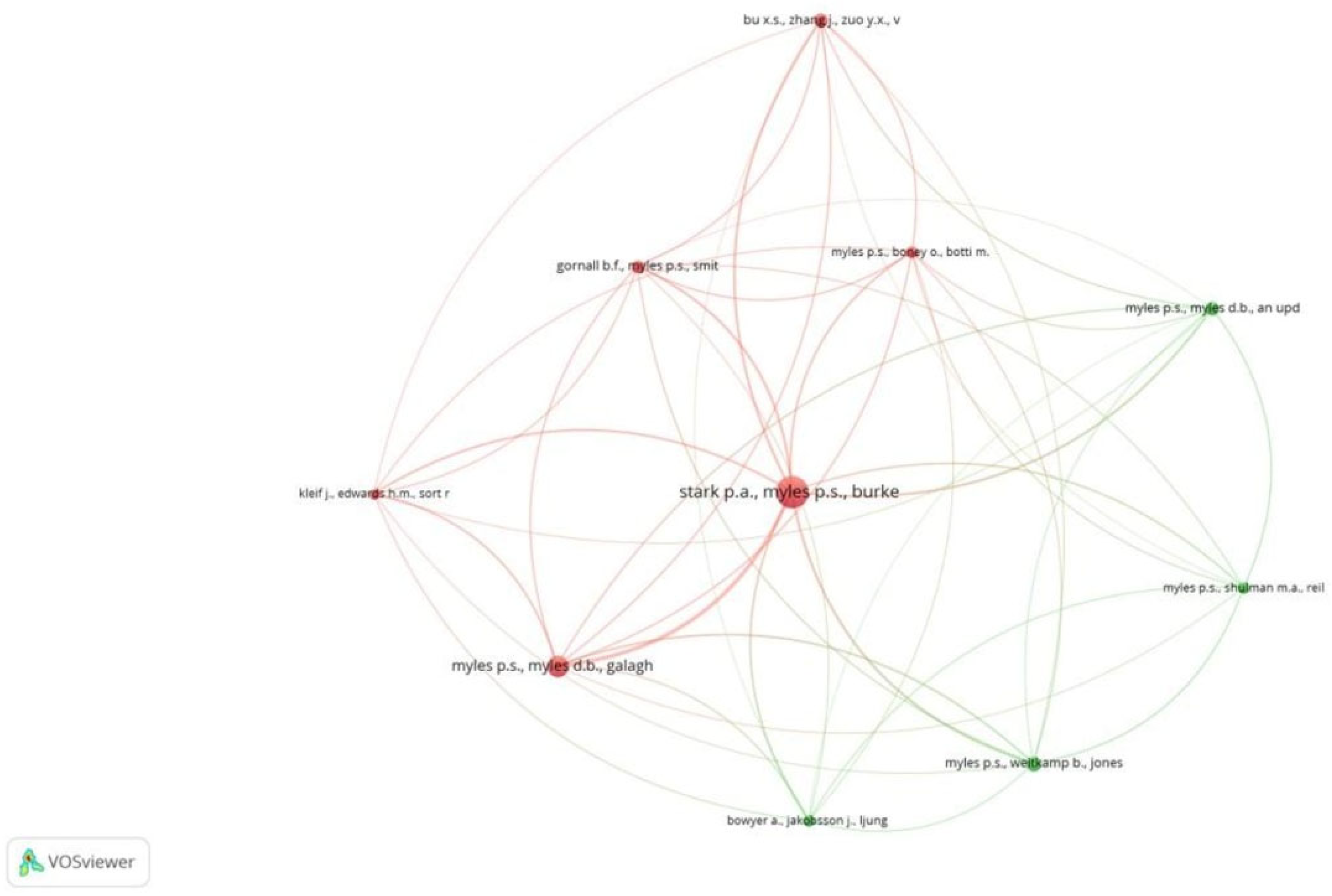 Figure 4). BJA had 18 documents and 964 citations for the documents. Of the 1901 authors, 7 met the threshold. We created a network with all 7 authors. The author, Paul S. Myles, had 1151 citations for 7 documents as an author (