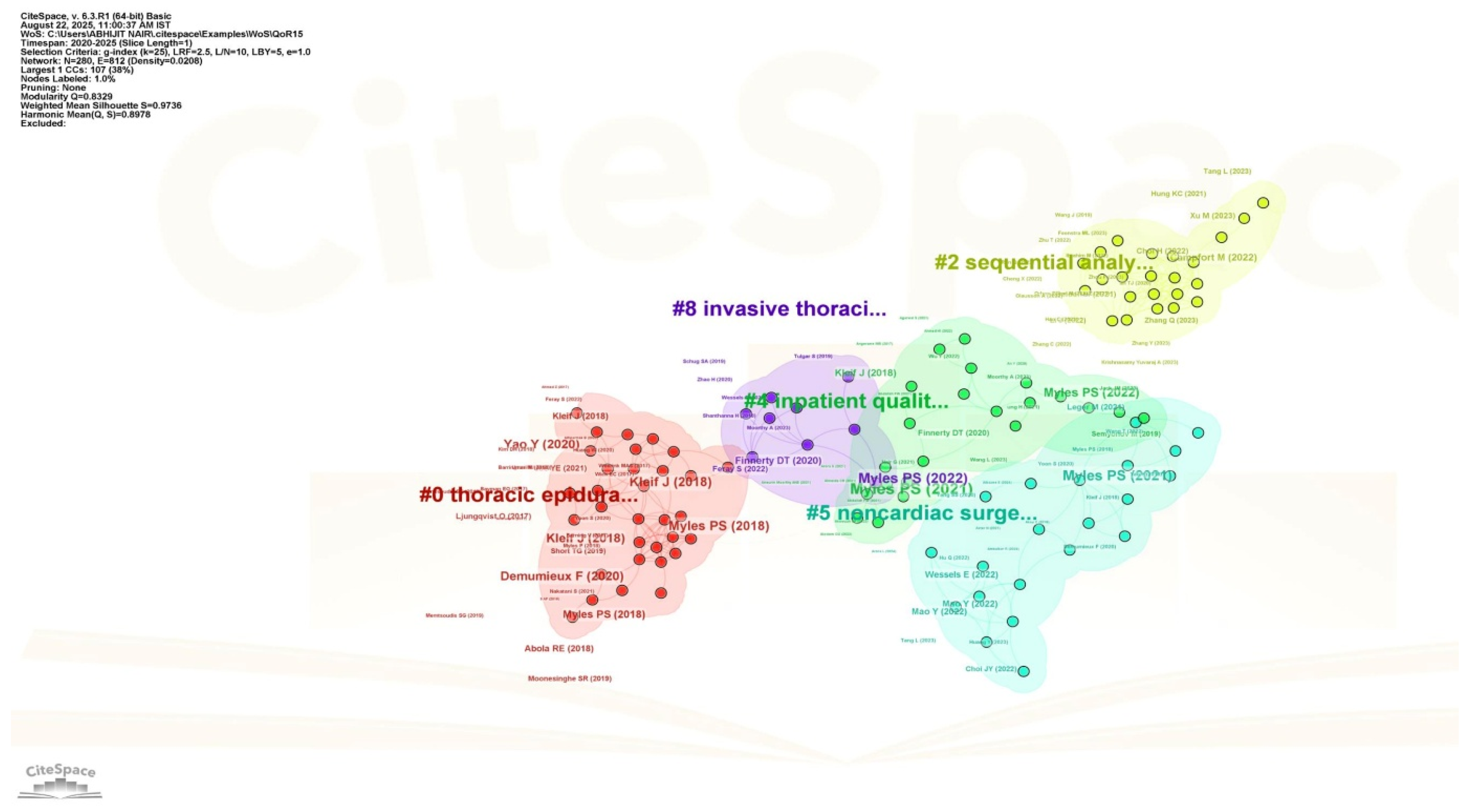 Figure 11, which is generated using CiteSpace software, depicts cluster analysis of the research using QoR15 as the keyword. The cluster labelled #0, i.e., thoracic epidural (red), is the largest and most densely connected cluster, suggesting that thoracic epidural anesthesia is an important link between QoR15 outcomes and postoperative care. The cluster labelled #2, i.e., sequential analysis (yellow), suggests a methodological advance, emphasizing the use of sequential analysis and contemporary statistical frameworks in studies related to QoR15 studies, in the form of review articles, systematic reviews, and meta-analysis. Authors Myles PS, Kleif J, and Finnerty DT are the influential authors based on the repeatedly identified central nodes, suggesting significant influence and multiple contributions that generate evidence of the extensive use of QoR15 in various settings. The prominence of Professor Paul S. Myles within the network reflects his foundational contributions, from developing the QoR-40 (2000) and QoR-15 (2013) scales to defining patient-comfort endpoints through the StEP-COMPAC initiative (2018) [