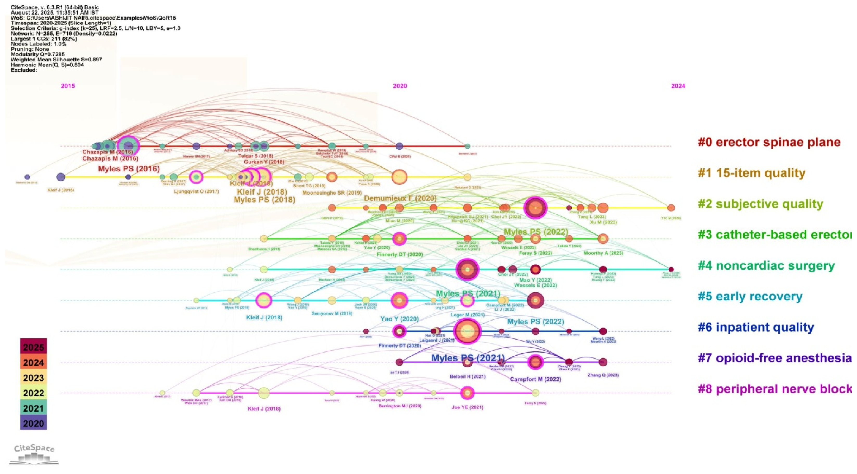 Figure 12, which is generated using the CiteSpace software. The largest cluster, labelled #0-erector spinae plane, suggests considerable research focus on regional anesthesia techniques and their role in enhancing postoperative recovery, as measured by QoR15. Other prominent clusters seen are #1-15-item quality and #2-subjective quality, indicating the use of the QoR15 tool for subjective patient-centered outcomes. The network links (edges) demonstrate high interconnectivity between clusters and major publications (for example, from subjective quality research to practical applications in nerve blocks or enhanced recovery after surgery), suggesting cross-referencing between publications and their interconnectivity. The authors Myles PS, Kleif J, Chazapis M, Finnerty DT are the most influential ones based on the multiple nodes, and also have several citations, suggesting their impact in strengthening the evidence. A modularity (Q) score of 0.829 and a silhouette (S) score of 0.974 indicate a well-structured and internally consistent network, suggesting distinct thematic clusters with minimal overlap [