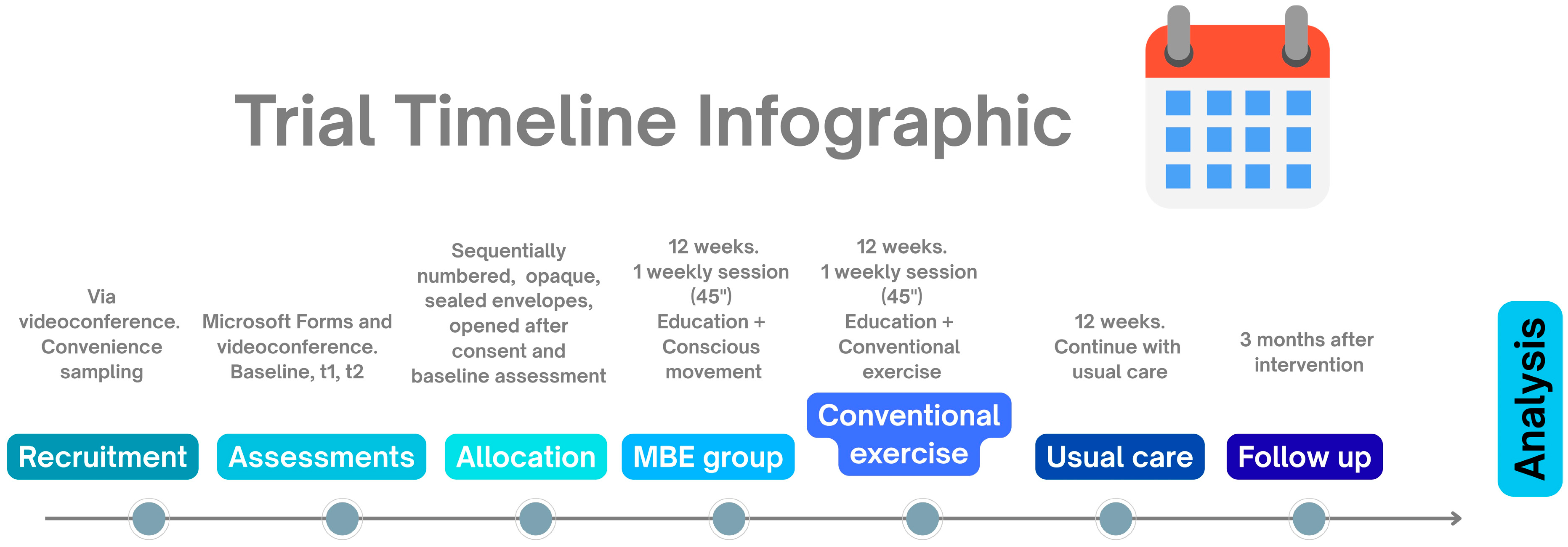 Sample size estimation considered three study groups, a one-tailed test (a larger effect size is expected in the MBE group), an α value of 0.05, a type II error (β) of 0.20 (80% power), and a precision of 6 (equivalent to a 15% change in the primary outcome, CFQ-14 total score at 12 weeks). Fatigue variance was set at 56.5 based on a previous study with a comparable population, intervention, and measurement tools [41]. Allowing for a 20% dropout rate and a design effect of 2 (due to non-probabilistic convenience sampling), a total of 147 participants (49 per group) will be required. Calculations were made using software developed by the Clinical Epidemiology and Biostatistics Unit of the Complexo Hospitalario Universitario de A Coruña, Spain [42].
