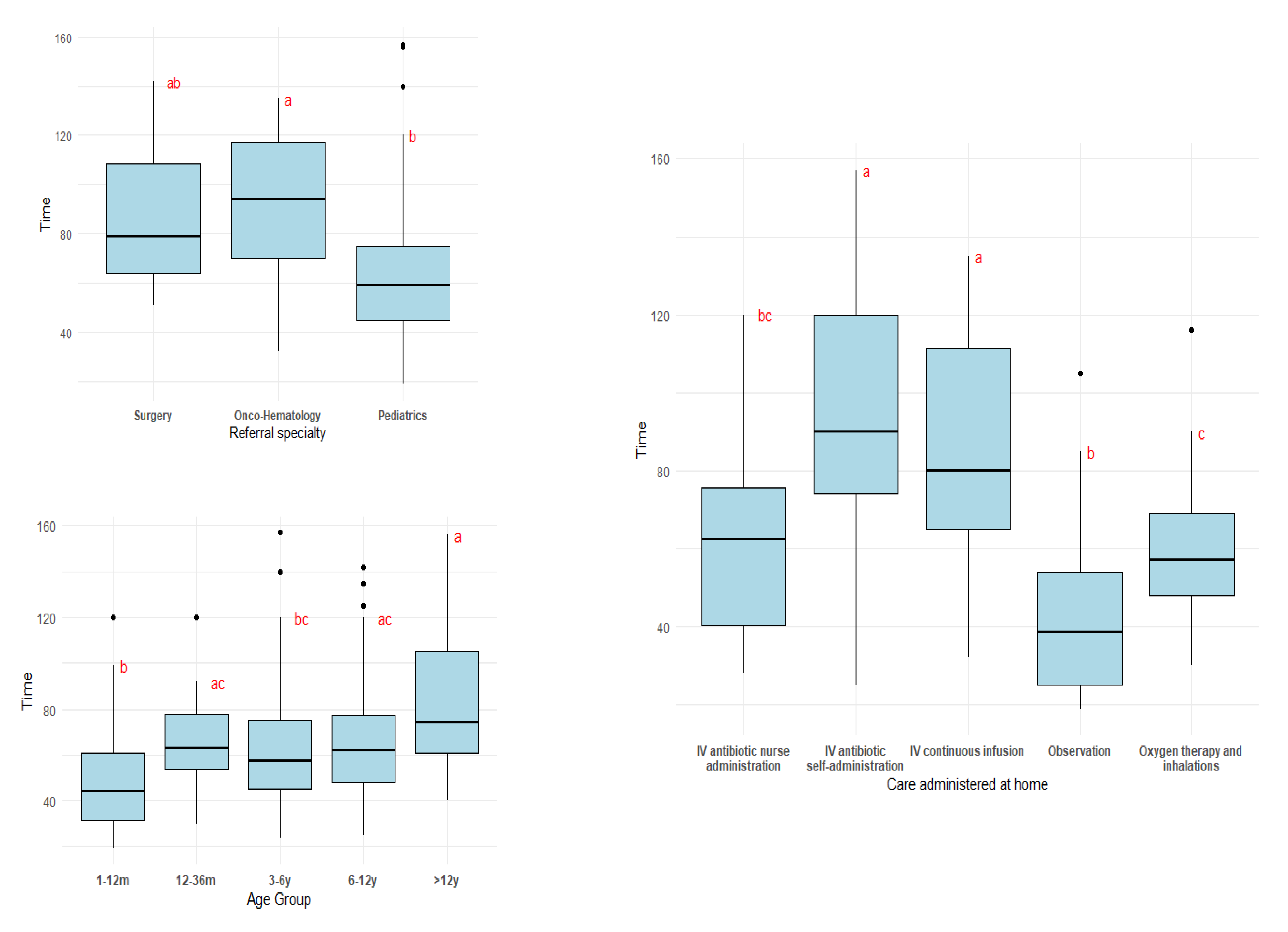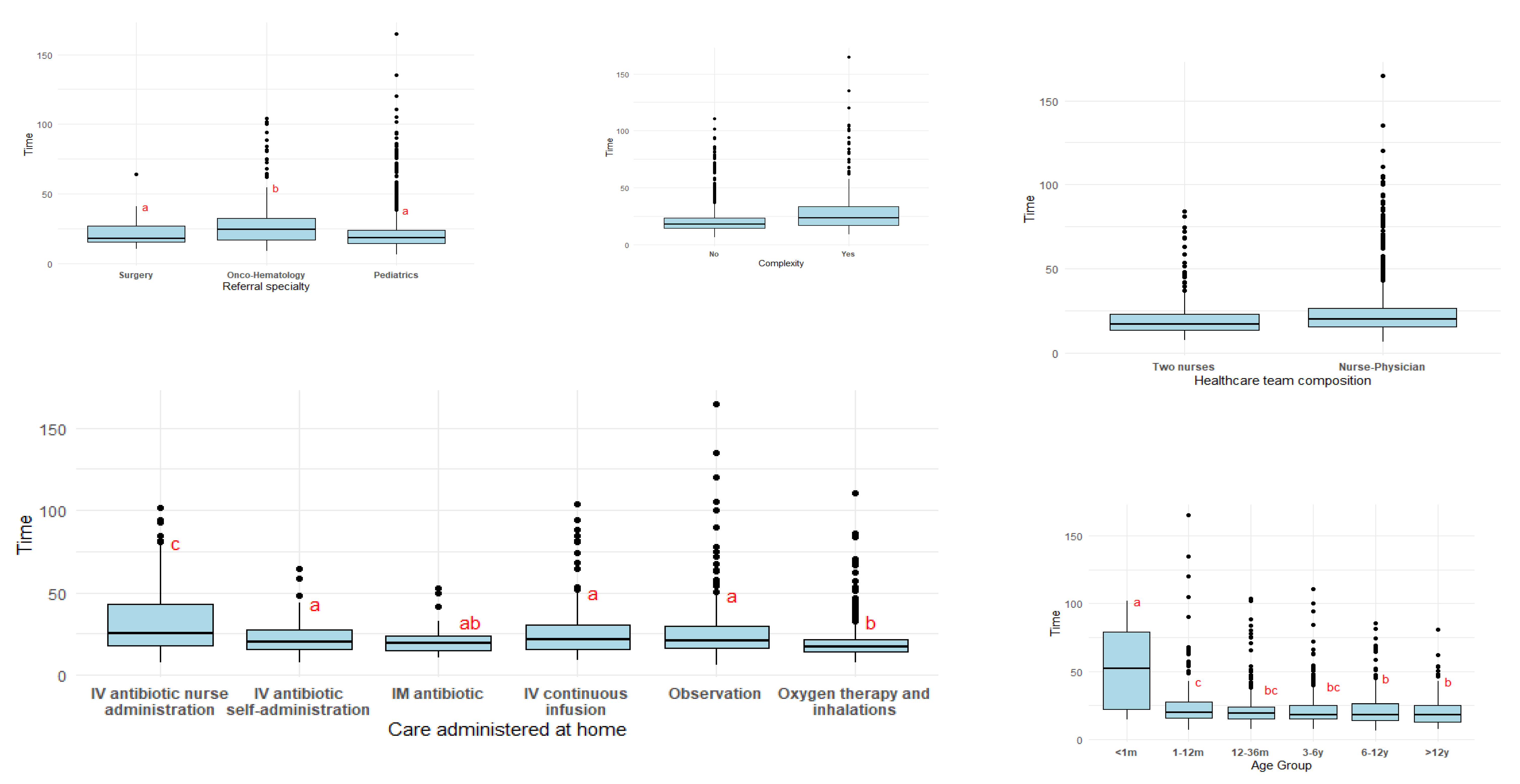 The longest visits corresponded to IV antibiotics administered by nurses (median 25.3 min), reflecting the need for on-site preparation and administration. Observation visits also showed relatively long and variable durations. Intermediate times were observed for IV continuous infusions, IM antibiotics, and IV antibiotics with self-administration, which generally involve more straightforward or caregiver-led procedures. Oxygen therapy and inhalations had the shortest visiting times (median 17.3 min), consistent with their standardized and quickly performed routines. The Observation category also showed relatively long and variable durations, likely due to the heterogeneity of clinical situations included in this category. The Kruskal–Wallis test confirmed significant differences among groups (χ