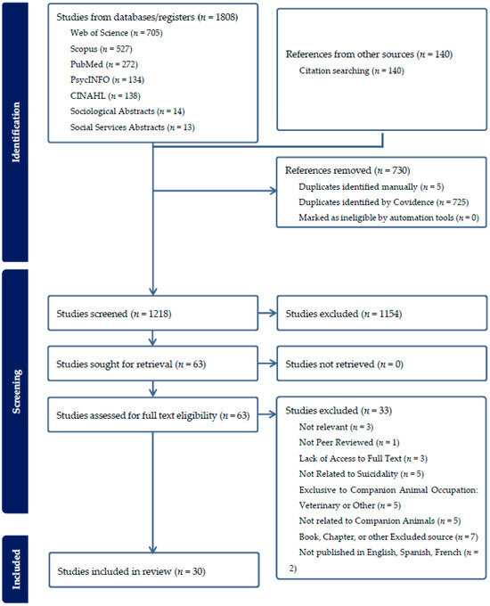 The research team utilized the PRISMA Extension for Scoping Reviews as a checklist and guideline to conduct this study [22]. The review protocol was published on OSF Registries on 8 October 2024 (DOI: 10.17605/OSF.IO/69WMP) [23]. The research team agreed on the review’s inclusion criteria through iterative discussion. Articles were deemed suitable if they pertained to (1) human–animal interactions with pet(s) or companion animals and (2) suicidality or suicide; (3) were peer-reviewed; (4) were published in English, Spanish, or French. No restrictions were established for the date of publication, human subjects involved, species of pet, or data type (i.e., quantitative or qualitative) in order to capture all relevant works. The authors also included studies where suicidality was either a primary or secondary outcome. While most grey literature, to include unpublished research, research or government reports, and conference abstracts were not included, dissertations were included as they represent original research and were identified by the research team as being useful in capturing emerging topics and increasing our breadth of evidence. The use of grey literature in reviews articles is supported by Mak and Thomas [24] as well as Nair and Borkar [25] to reduce publication bias. Systematic reviews or scoping reviews were excluded as they do not represent original research. As this study focuses on the impact of companion animals as pets, articles pertaining to service animals and therapy animals were excluded, as these animals are specifically trained to fulfill a different, and intentionally therapeutic, role in the lives of humans. Research pertaining to emotional support animals was included as emotional support animals are companion animals that provide comfort, companionship, and/or emotional stability to a person with a psychological diagnosis without specialized training, and are handled by an individual for their personal benefit (versus a therapy dog which is handled by a therapy professional for goal-directed therapeutic benefit within the context of treatment). As such, the research team determined emotional support animals serve a similar purpose to companion animals kept as pets, which informed the decision to include them in this review. The research team additionally agreed to exclude articles exclusively related to the suicide risk of veterinarians within the context of their occupation. The authors concluded that these articles described an occupational hazard outside the scope of this review. However, articles pertaining to veterinarians’ suicide risk as it relates to a personal, non-occupational relationship with a companion animal were included.