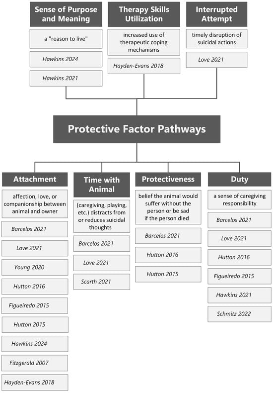 Nine (n = 9) articles identified in this review demonstrated the capacity for animals to serve as a protective factor against suicide. Multiple pathways for suicide prevention were represented in the research (see Figure 2). The most frequently identified mechanism for suicide prevention was attachment to a companion animal through affection, love, or companionship [27,28,29,30,31,32,33,34,35]. For example, a suicidal individual living with HIV identified “unconditional love” from their pet as a primary protective factor against suicide [32]. A “sense of connectedness” between participants and their pets [33] as well as participants considering their pets “like family” [34], symbolized the strong emotional bond that can serve as a protective factor against suicide. Attachment to an animal was also shown to exist in the absence of attachments to other people, as is the case in the older adult population studied by Figueiredo et al. [31].