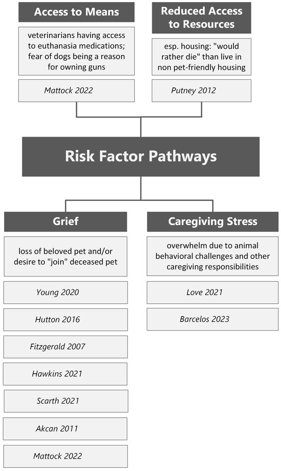 The research also revealed that pets can pose a unique risk factor for suicide (see Figure 3). Most notably, grief and loss associated with the death or loss of a companion animal were represented as a risk factor for suicide in multiple studies [29,30,34,36,38,39,40]. The emotional distress associated with the loss of a pet can contribute to suicidal ideation and/or behaviors, with one individual noting they wanted to “join” a beloved deceased pet [40] in their suicide note. Another identified theme was the stress associated with animal caregiving to include animals with behavioral difficulties [28,41]. Caring for an animal with behavioral or medical challenges can contribute to isolation and other concerns, which may impact suicidality [42]. Access to resources was also identified as a challenge for some individuals, such as one participant reporting they would rather die by suicide than live in housing that does not accommodate their pet [42]. Another study represented that personal and/or professional interrelations with animals could indirectly increase access to suicidal means [40]. This study outlined specific examples documented in coroner reports, including an individual who died by suicide utilizing a gun purchased due to a fear of dogs, an individual who used a dog leash as a hanging device, and multiple separate cases in which veterinarians died by suicide using the drugs typically used to euthanize animals in their veterinary practice.