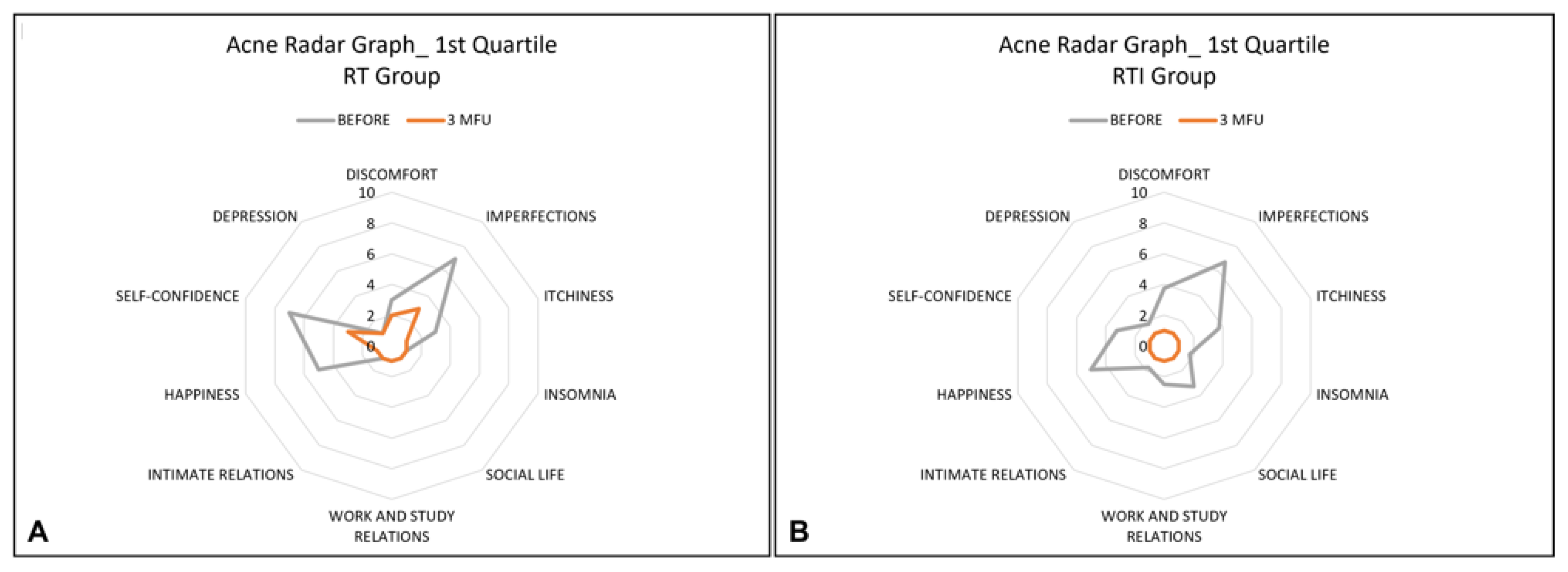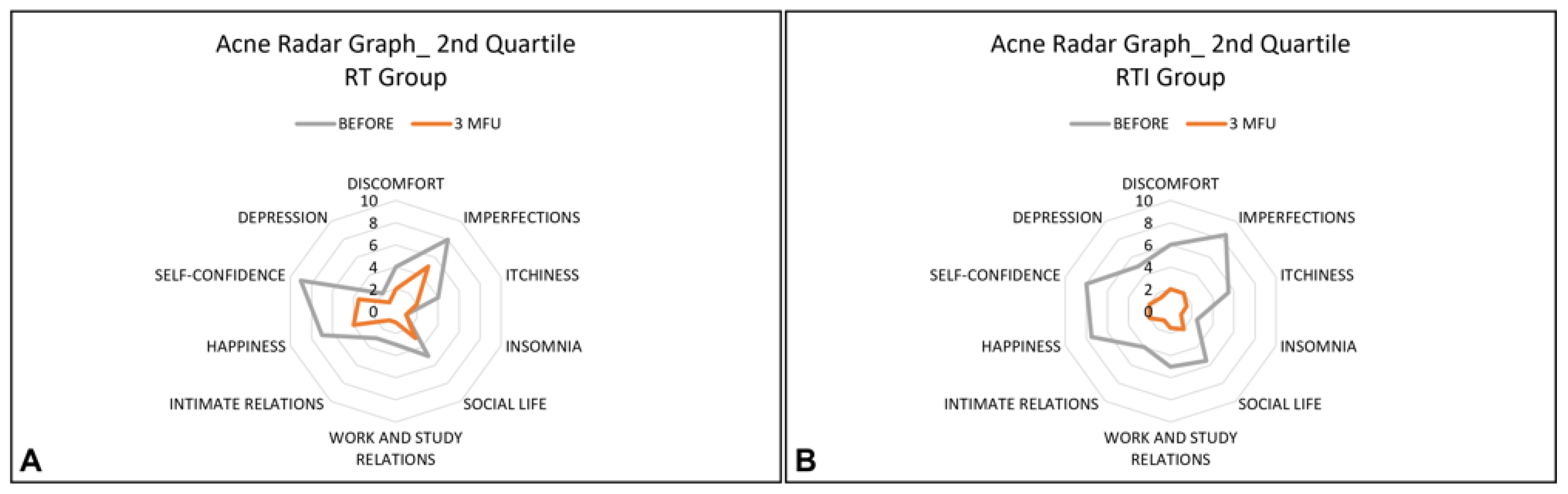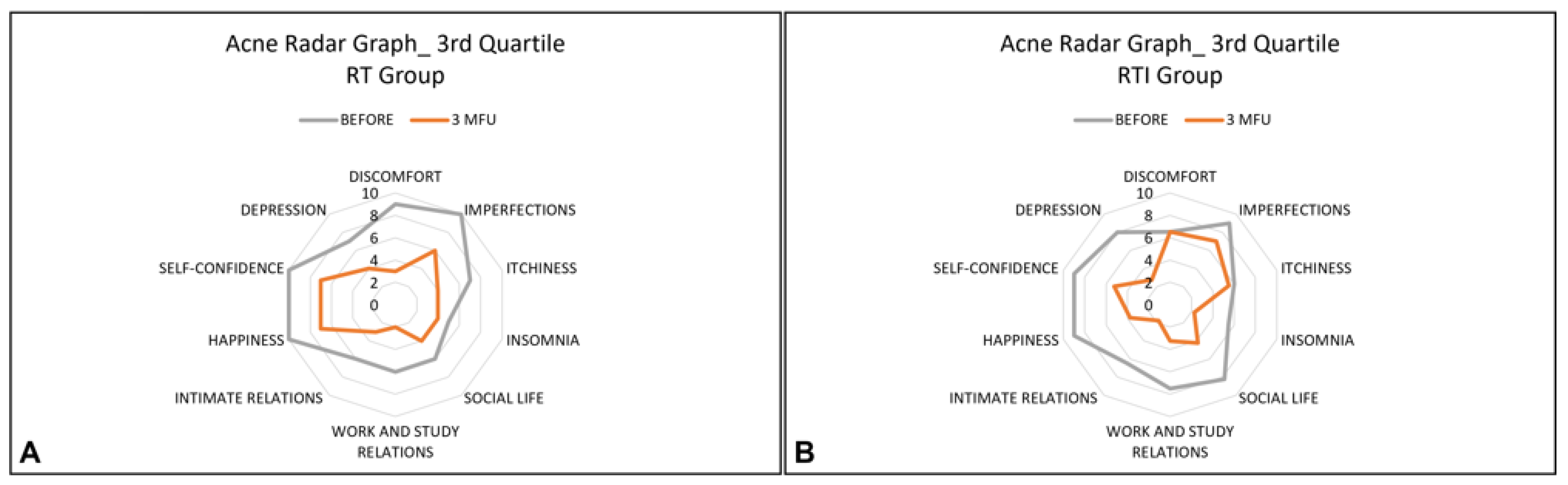 Mean scores for all Acne Radar Questionnaire items improved in both groups. For the RT group, there were significant decreases in both objective parameters (imperfections from 8.2 ± 1.7 pre-treatment to 5.4 ± 2.4 post-treatment, p-value < 0.05) and subjective parameters (self-confidence from 8.0 ± 2.9 pre-treatment to 4.5 ± 2.1 post treatment, p-value < 0.05; happiness from 6.6 ± 3.1 pre-treatment to 4.3 ± 3.0 post-treatment, p-value < 0.05; discomfort from 5.6 ± 3.0 pre-treatment to 3.0 ± 2.3 post-treatment, p-value < 0.05).