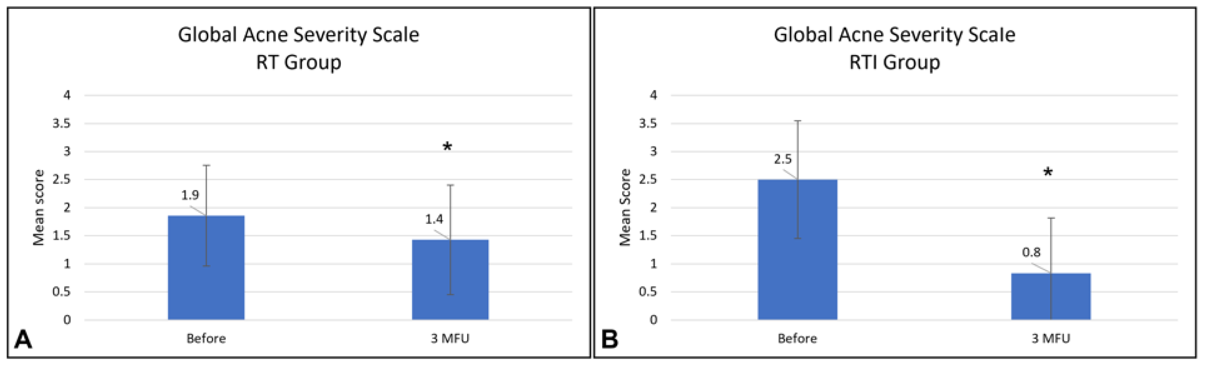 Figure 4. Mean GEA scores before and at 3 MFU after the last treatment session for the RT group (A) and for the RTI group (B). GEA, Global Acne Severity. Asterisks (*) indicate statistically significant differences compared with baseline (p < 0.05).
