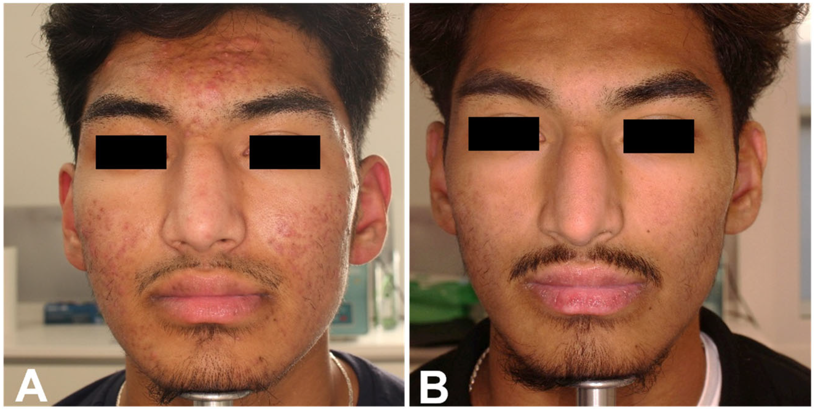 9. Reynolds, R.V.; Yeung, H.; Cheng, C.E.; Cook-Bolden, F.; Desai, S.R.; Druby, K.M.; Freeman, E.E.; Keri, J.E.; Gold, L.F.S.; Tan, J.K.; et al. Guidelines of care for the management of acne vulgaris. J. Am. Acad. Dermatol. 2024, 90, 1006.e1–1006.e30. [Google Scholar] [CrossRef]