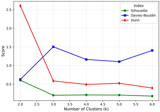 Determination of the optimal number of clusters using internal validation indices. The optimal number of clusters was calculated using three internal verification indicators (Silhouette, Dunn, and Davies–Bouldin). The Silhouette value represents the balance of cohesion and separation, and the Dunn index considers the maximum distance within a cluster compared to the minimum distance between clusters. The Davies–Bouldin index represents the average similarity between clusters, and the lower the value, the better the cluster quality. As a result of comprehensively evaluating the three indicators, it was confirmed that the balance of separation and cohesion between clusters was the best at k = 2.