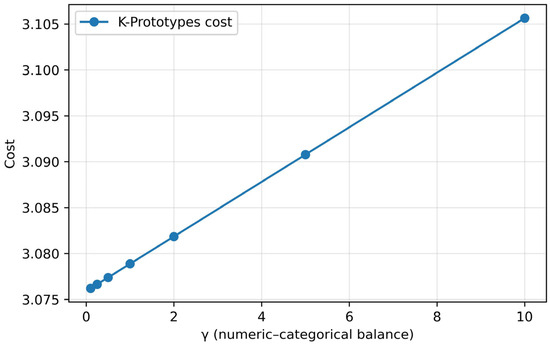 Evaluation of the γ (numeric-categorical balance) parameter in the k-prototypes algorithm. In the k-prototypes algorithm, the cost was evaluated by varying the balance weight (γ) between the continuous variable and the categorical variable in the range of 0.1–10. The interval in which cost is minimized was observed at γ = 0.1, which means that the balance between cluster cohesion and separation is the best when the contribution of the continuous variable is somewhat high. Accordingly, in this study, the γ value of the final model was set to 0.1.