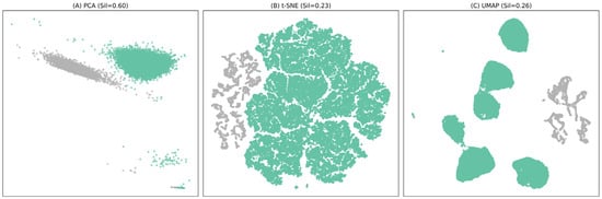 Comparison of dimensionality reduction techniques: PCA, t-SNE, and UMAP. The cluster structure was visualized in a two-dimensional space using three-dimensional reduction techniques (PCA, t-SNE, UMAP). The silhouette score of PCA (A) was the highest at 0.60, and the separation between clusters was the most obvious within the linear structure. t-SNE (B) preserved the nonlinear structure well, but the boundaries between clusters somewhat overlapped due to the high local cohesion (Silhouette = 0.23). UMAP (C) formed a visually distinct cluster boundary, and the silhouette coefficient (Silhouette = 0.26) was slightly lower than that of PCA at the intermediate level. As a result of a comprehensive comparison of the three techniques, it was confirmed that UMAP did not affect the maintenance of actual cluster quality (Silhouette = 0.61) while stably expressing the latent structure of nonlinear data. Cluster 0 (shown in green; Set2[0]), Cluster 1 (shown in gray; Set2[1]).
