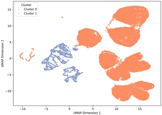 UMAP visualization of k-prototypes clustering results (k = 2). Two clusters (Cluster 0, Cluster 1) classified by the k-prototypes algorithm were visualized in a two-dimensional space through UMAP dimension reduction. Cluster 0 (blue) appeared in a relatively aggregated form and is a cluster characterized by physiological stability and high average blood pressure (MAP). On the other hand, Cluster 1 (orange) showed a wide degree of dispersion, low age, and physiologically unstable characteristics. The two clusters are clearly separated visually, reflecting differences in physiological and clinical profiles between clusters.