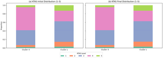 Comparison of initial and final KTAS distributions between clusters. (a,b) are cumulative ratio graphs showing the distribution of the initial and final classifications of KTAS by cluster, respectively. In Cluster 0, KTAS stages 3–4 accounted for about 86% of the total, and the proportion of relatively stable moderate patients was high. On the other hand, in Cluster 1, the proportion of patients with KTAS stage 2 or higher (moderate or higher) was relatively high, and it was identified as a cluster with a larger clinical severity (χ2 = 2032.18, df = 4, p < 0.001).