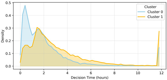 Density distribution of decision time between clusters. This is a density distribution diagram comparing the decision time (decision time) of hospitalization or discharge by cluster. Cluster 0 (blue) was determined relatively quickly with a mean of 2.12 ± 3.59 h and a median of 1.00 h (quartile range between 0.50 and 2.48). On the other hand, cluster 1 (orange) showed a tendency to delay decisions with a mean of 3.64 ± 6.89 h and a median of 2.24 h (1.36 to 3.85). The difference between the two clusters was found to be statistically significant in the Kruskal–Wallis test (H = 1323.69, p < 0.001).